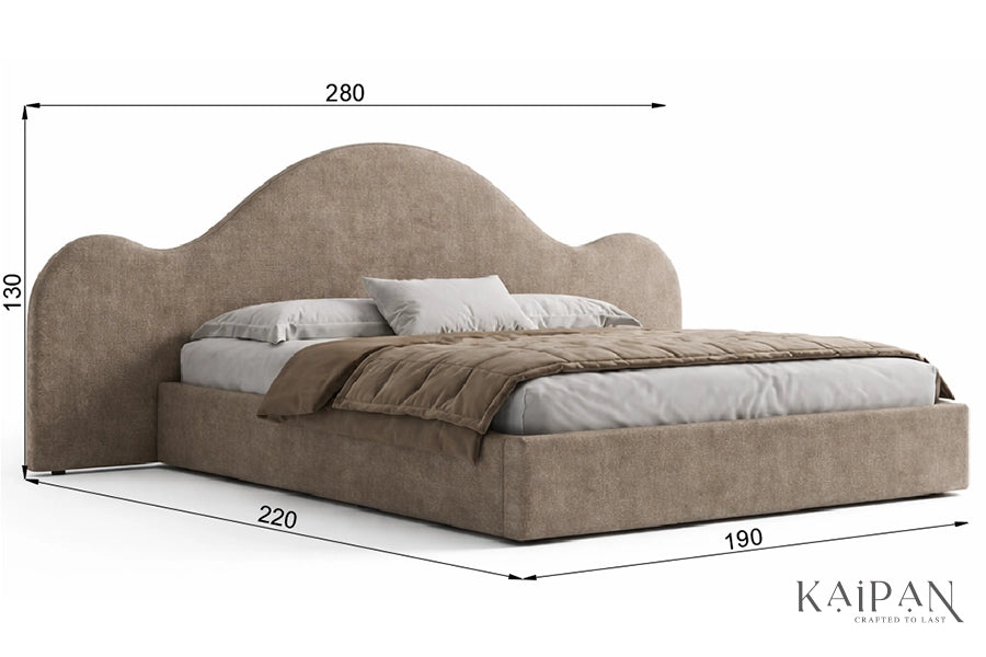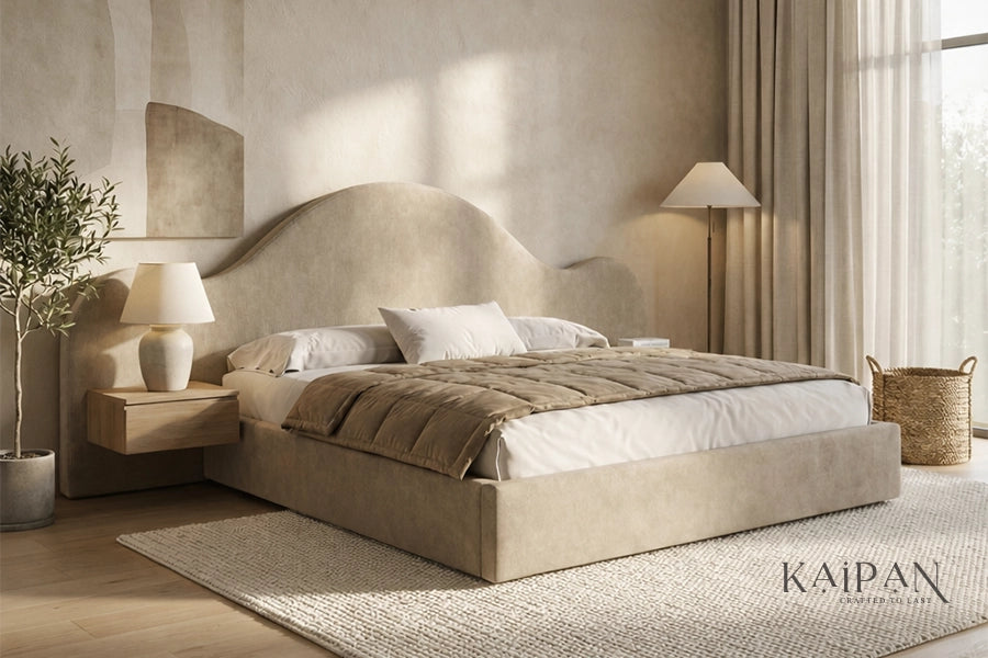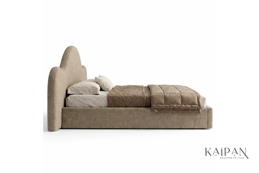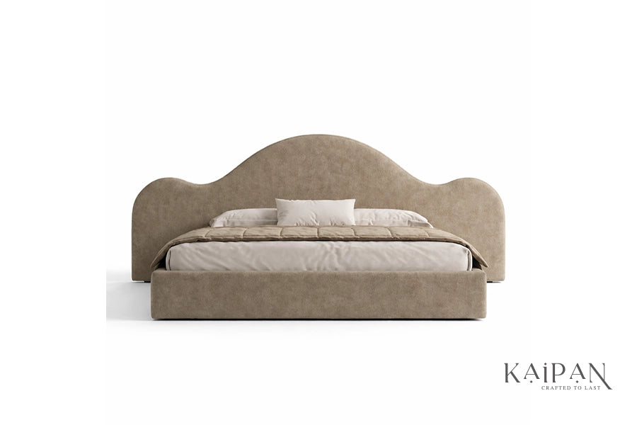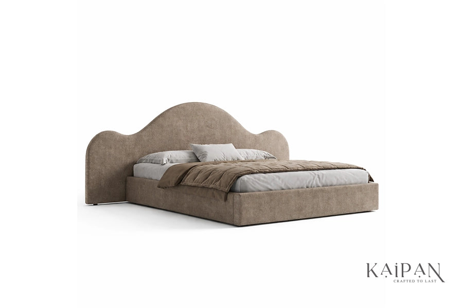 This bed features an organically shaped upholstered headboard with flowing curves that create a soft, architectural silhouette. Paired with a clean, low-profile frame, it is finished in a warm neutral fabric that adds calm and character to modern bedroom interiors. Designed for everyday comfort and reliable support, it offers a refined balance of artistic form, simplicity, and understated luxury.