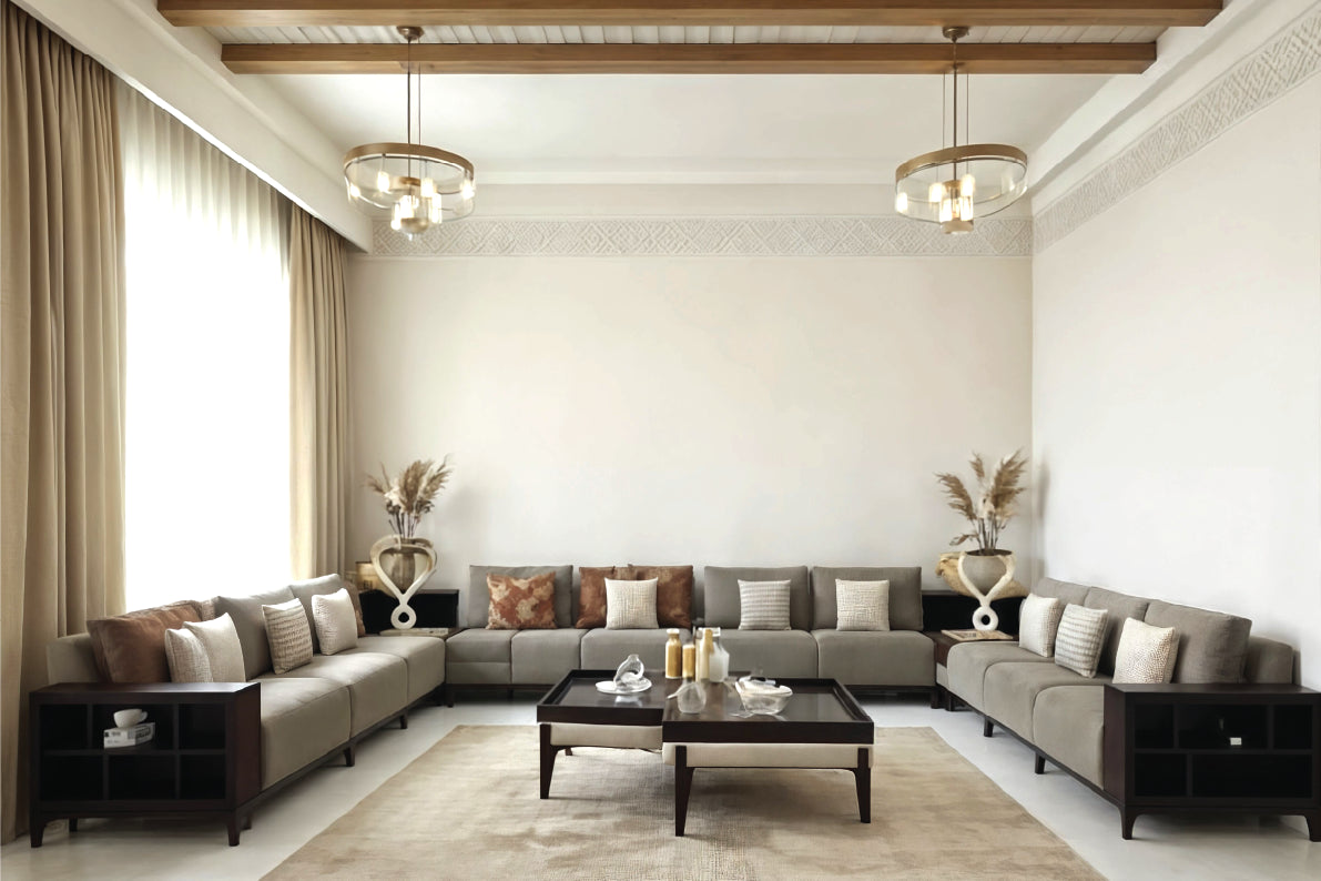 This sofa set features a clean, architectural design with generous seating and a well-balanced layout. Upholstered in a soft, neutral fabric and paired with structured arm detailing, it creates a refined and welcoming living space. Designed for both comfort and elegance, it’s ideal for spacious interiors and everyday gatherings.