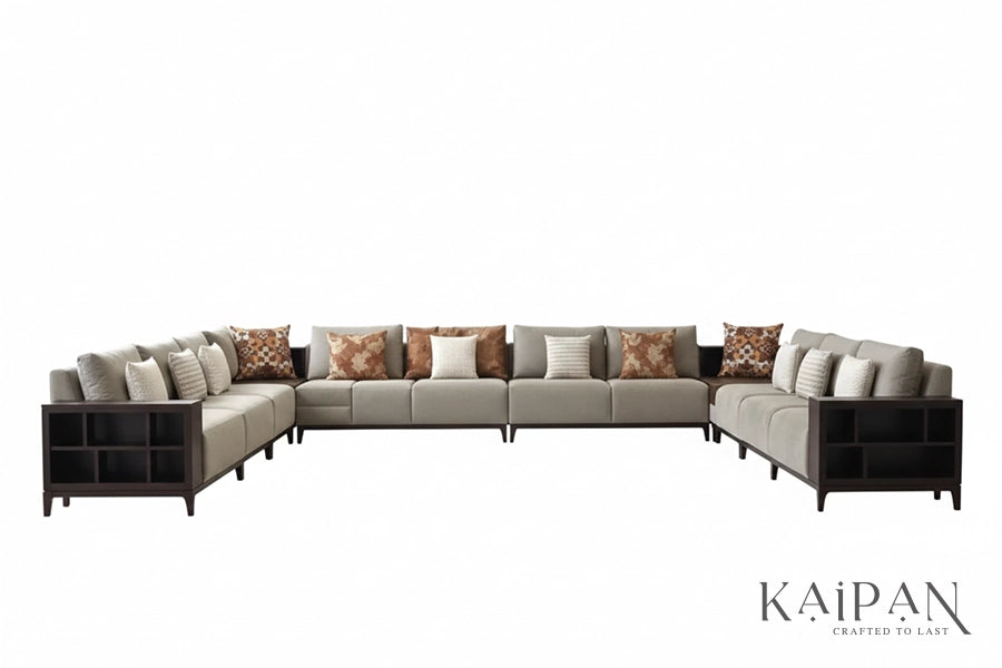 Design Details: Structured modular layout with clean lines and integrated side tables, creating a balanced, elegant silhouette suited for spacious living rooms.