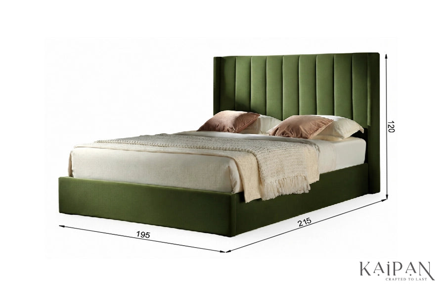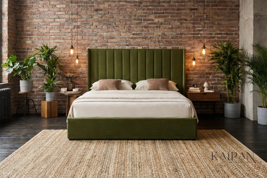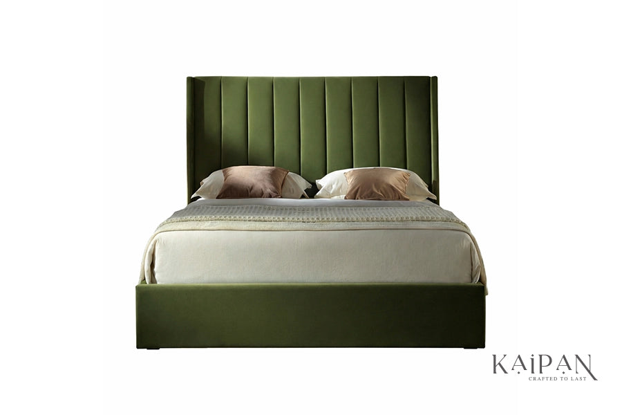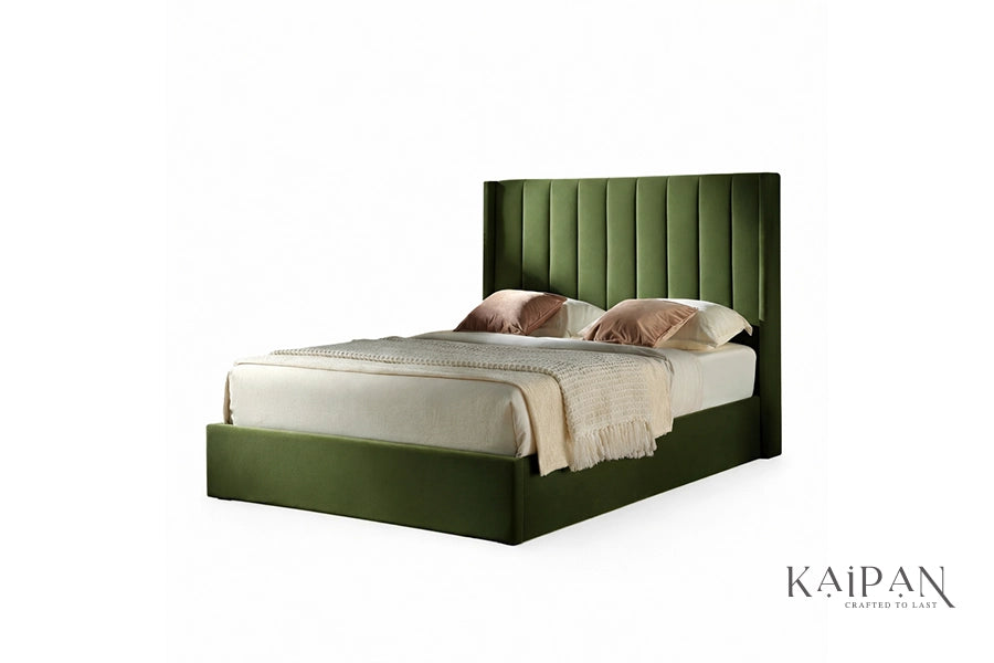 This bed features a tall, upholstered headboard with clean vertical panel detailing that adds depth and a contemporary sense of structure. Paired with a smooth, low-profile frame, it is finished in a rich, muted fabric that brings warmth and a refined character to modern bedroom interiors. Designed for everyday comfort and dependable support, it offers a balanced blend of simplicity, elegance, and understated luxury.