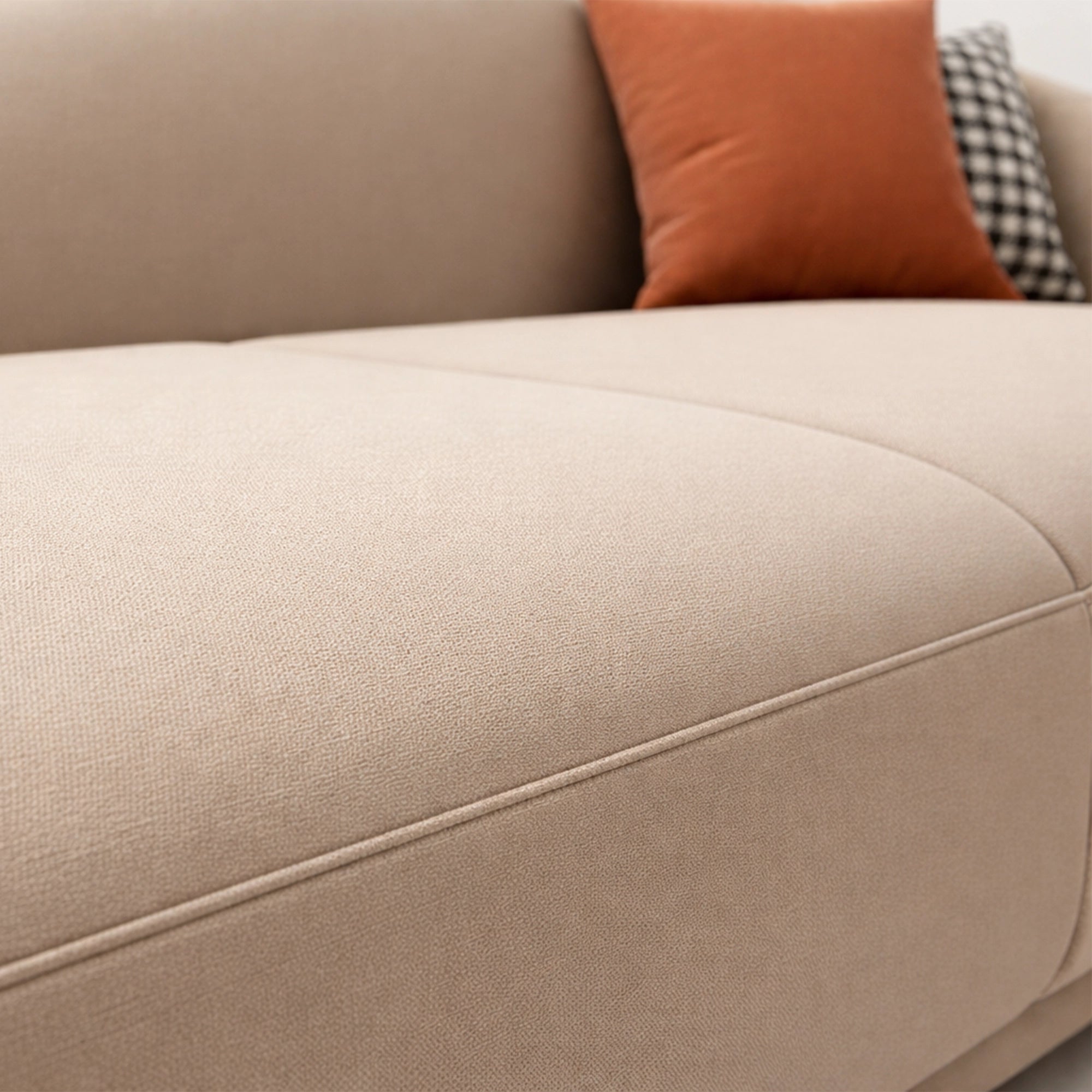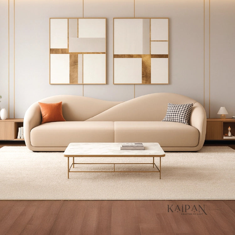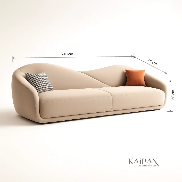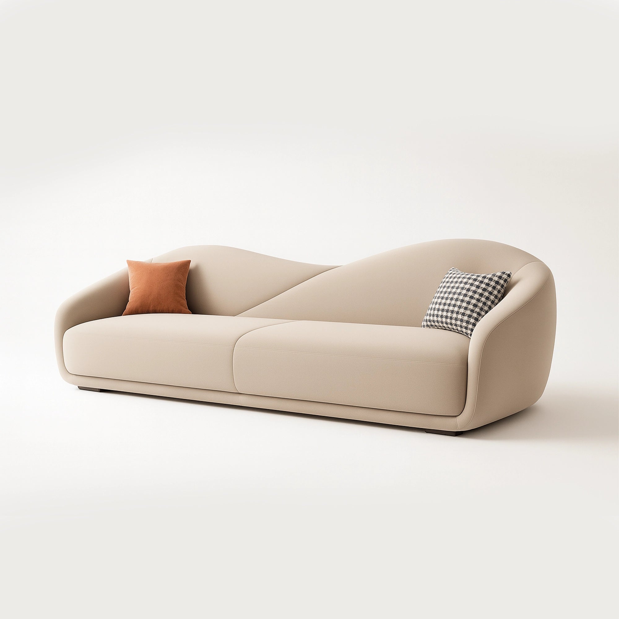 This sofa features an elegant, sculpted silhouette with smooth curves and a modern, asymmetrical design. Upholstered in a soft, neutral fabric, it brings a calm and luxurious feel to the space while offering generous comfort. Perfect for contemporary interiors, it adds warmth, balance, and understated sophistication to any living room.