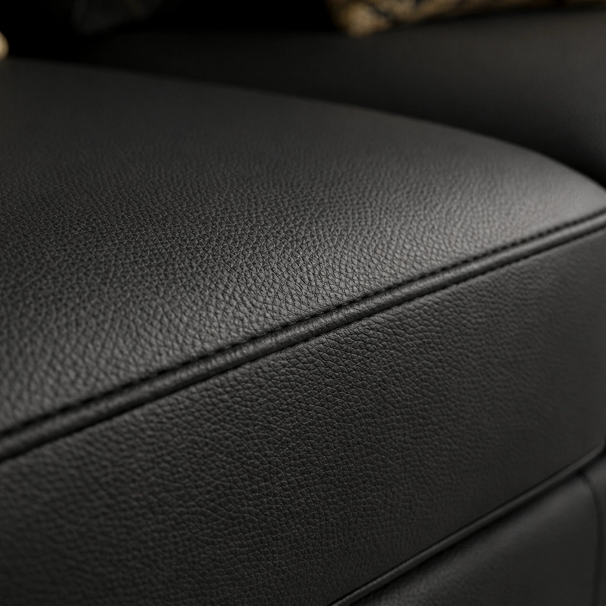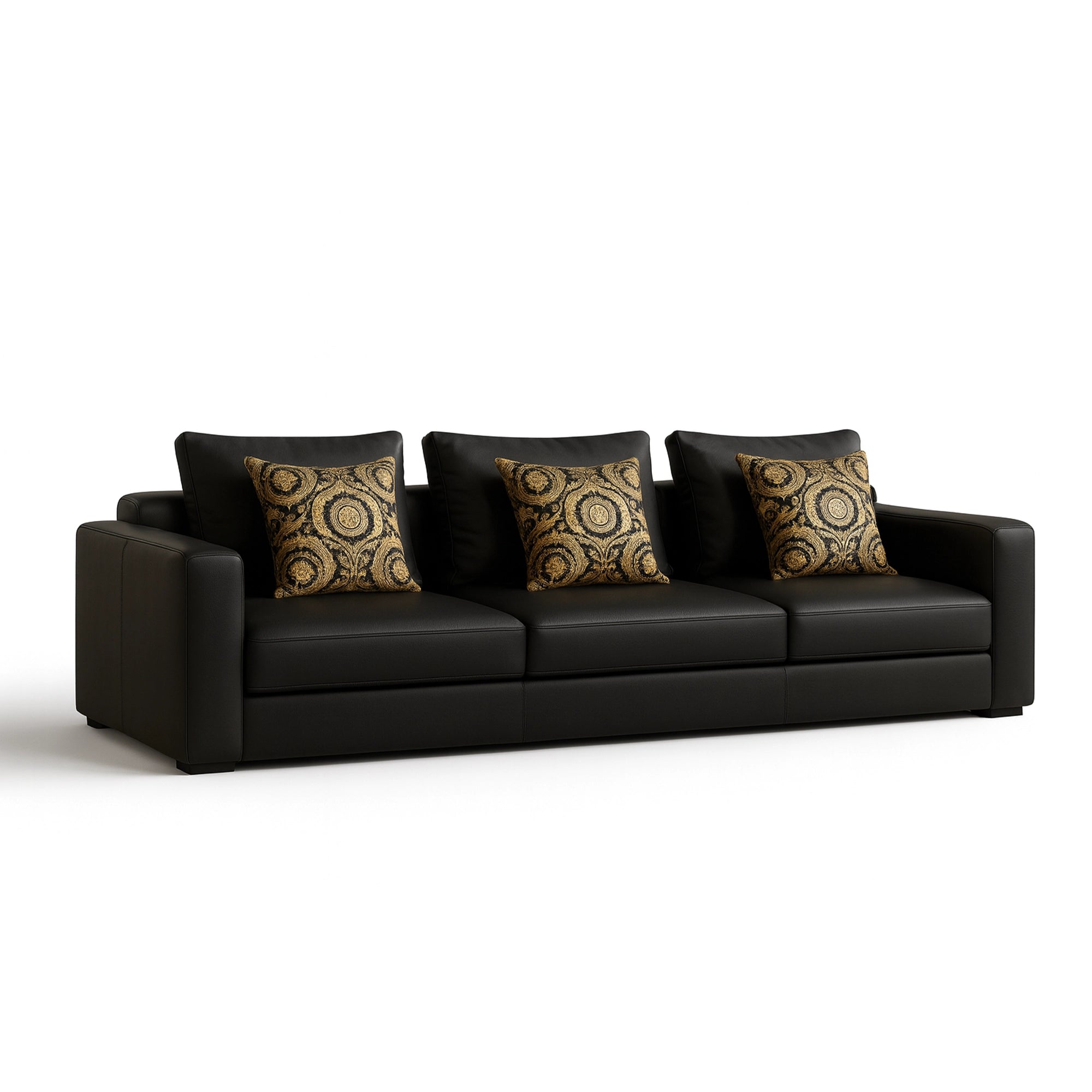 This sofa features a sleek, structured design with clean lines and a bold, contemporary presence. Upholstered in a smooth, dark finish and paired with elegant accent cushions, it brings a sense of modern sophistication to the living space. Designed for comfort and durability, it offers supportive seating with a timeless, confident style.