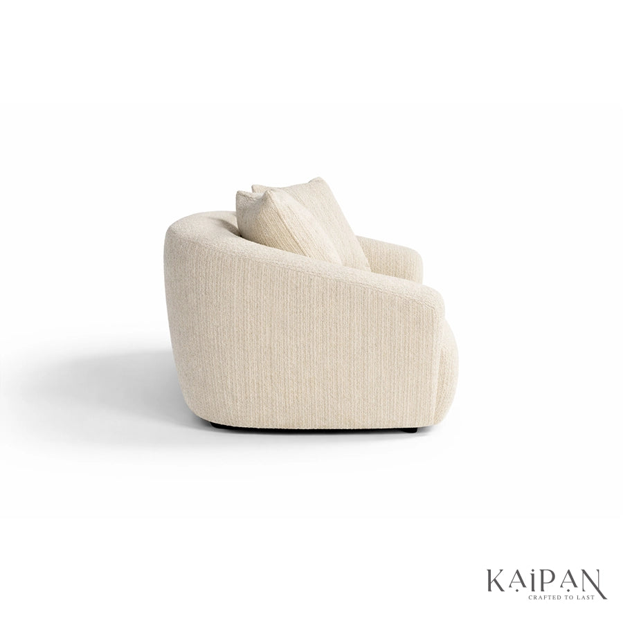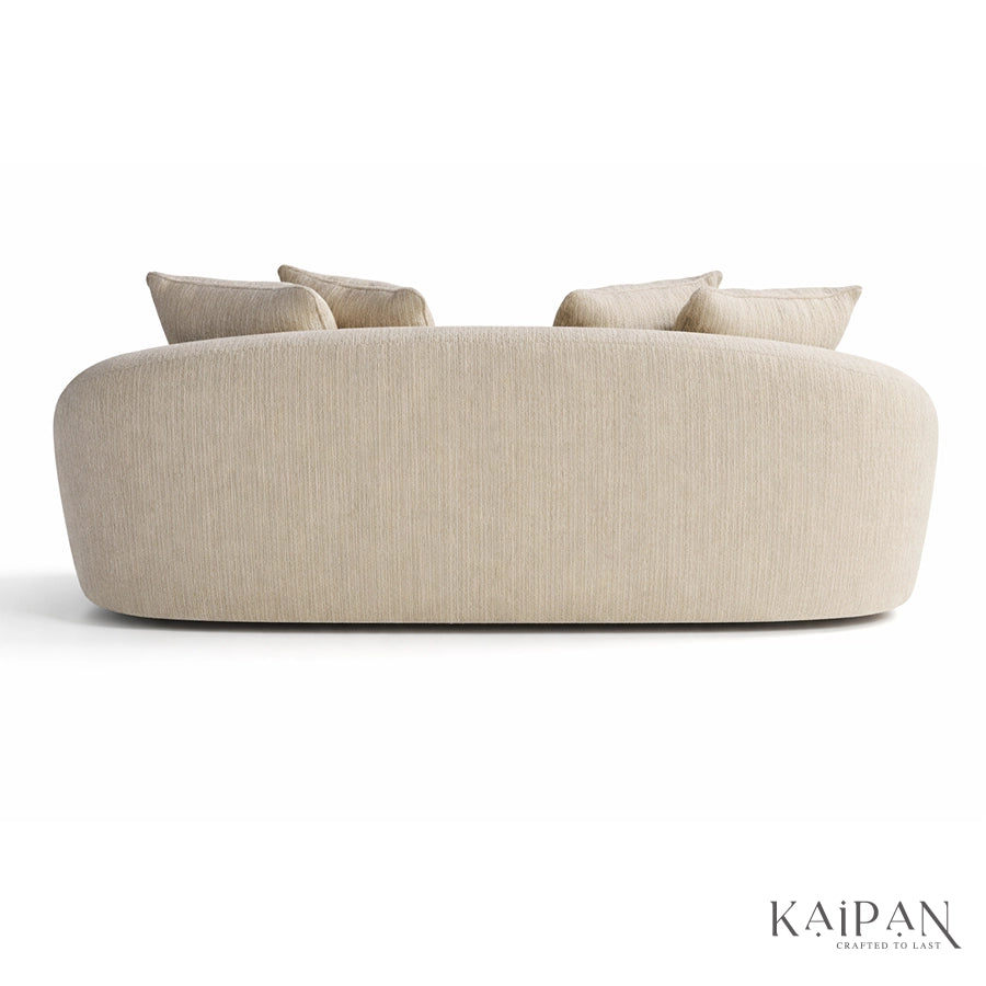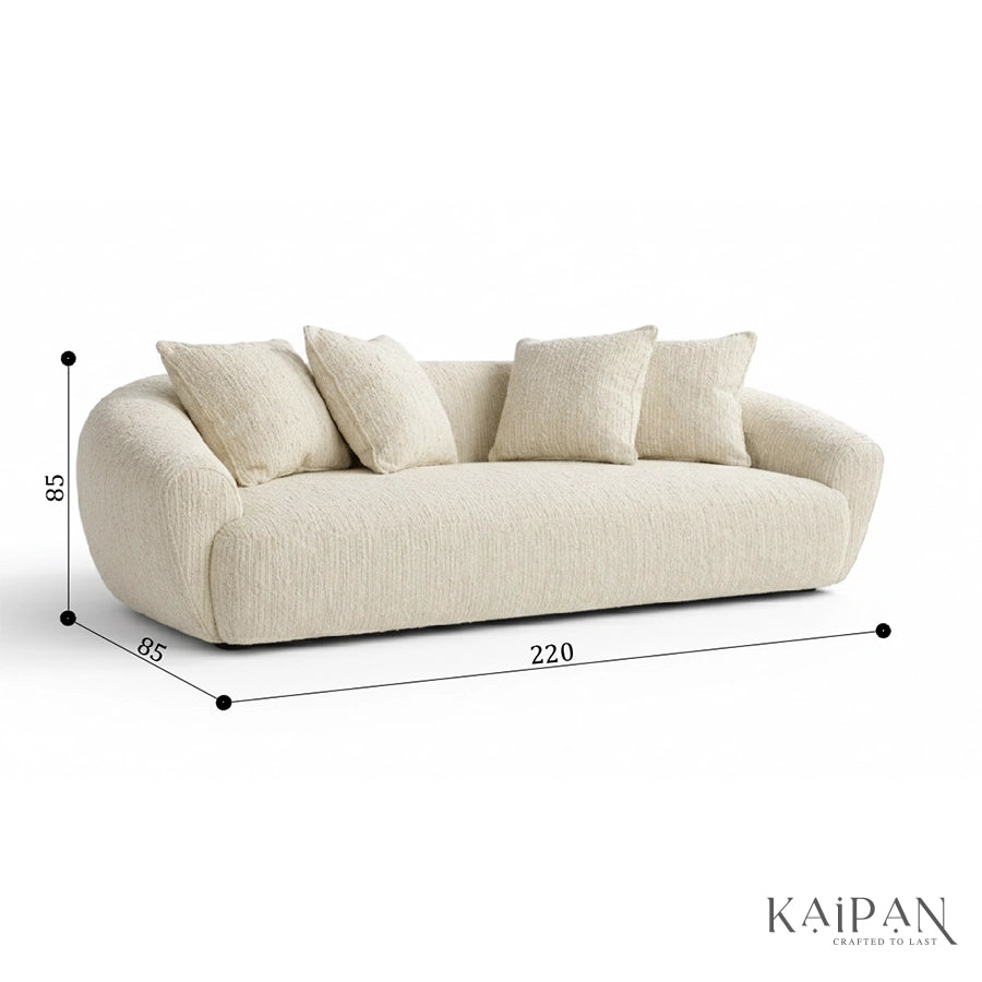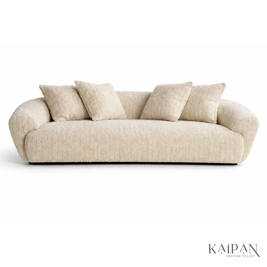 This sofa is a modern sculptural sofa designed to bring effortless luxury and comfort into contemporary living spaces. Featuring a soft, rounded silhouette with seamless curves and a low-profile form, this sofa creates a calm and inviting visual presence. Upholstered in a premium textured fabric in a warm neutral tone, it offers a cozy yet refined feel that blends easily with any interior palette. Deep seating and plush back cushions provide cloud-like comfort, making it ideal for relaxed lounging, while the minimalist design and concealed base enhance its elegant, designer appeal, perfect for living rooms, luxury apartments, and statement interiors.
