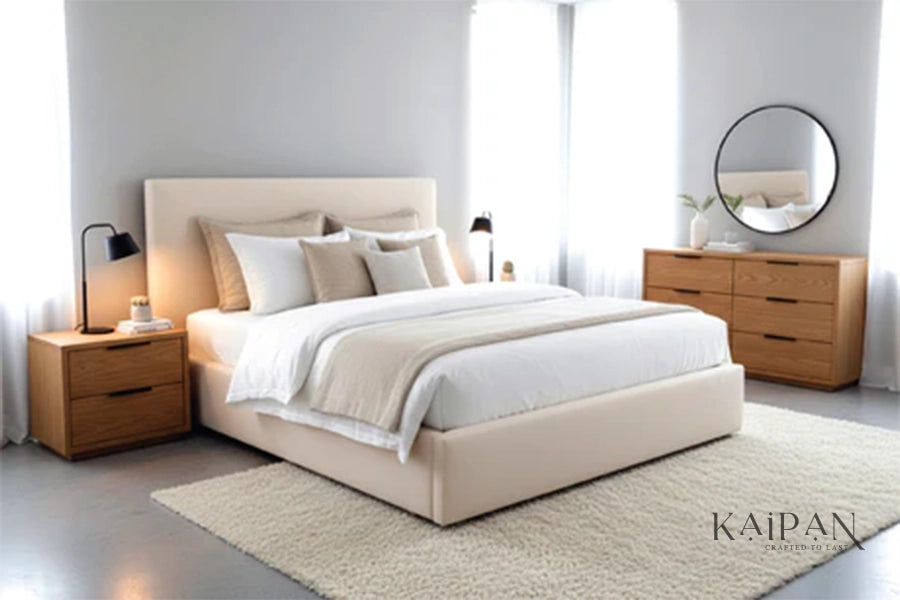 Design Details: Clean, straight-lined silhouette with a padded headboard and side panels, creating a calm, contemporary bedroom aesthetic.