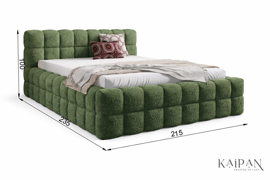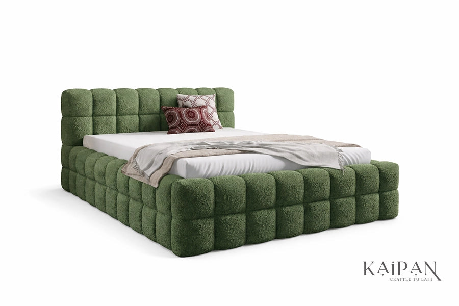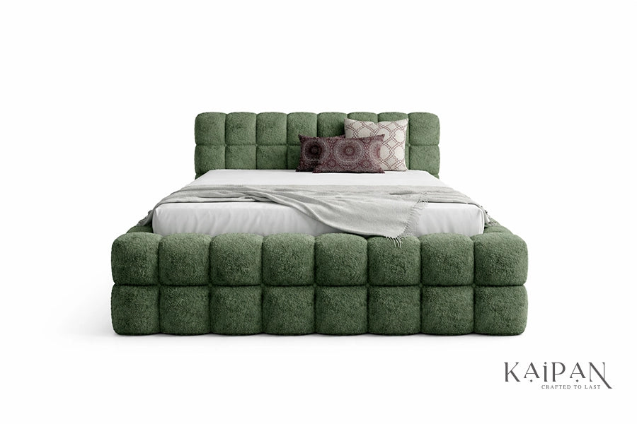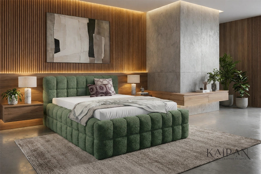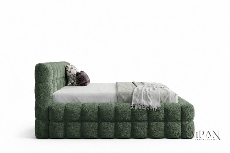 This bed features a fully upholstered design with plush, grid-style cushioning across the headboard and frame, creating a bold and inviting silhouette. Finished in a richly textured fabric, it adds depth, warmth, and a distinctive character to contemporary bedroom interiors. Designed for everyday comfort and dependable support, it offers a refined balance of softness, structure, and modern luxury.