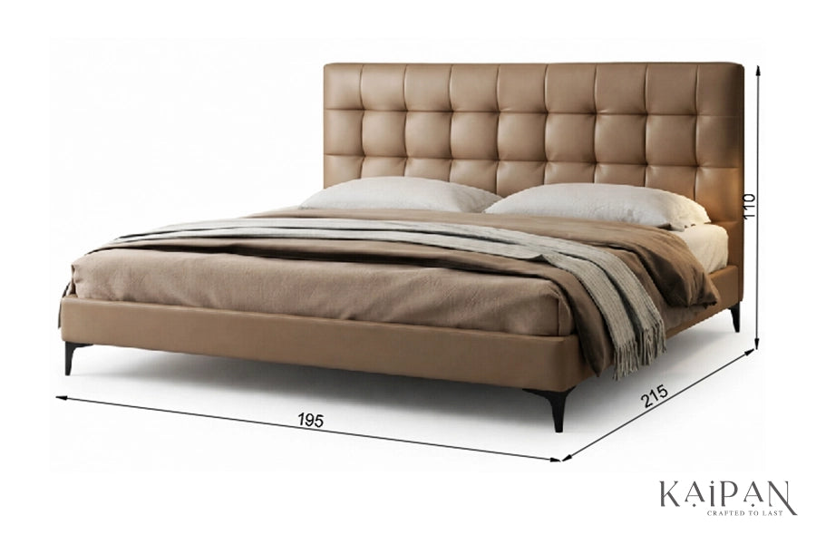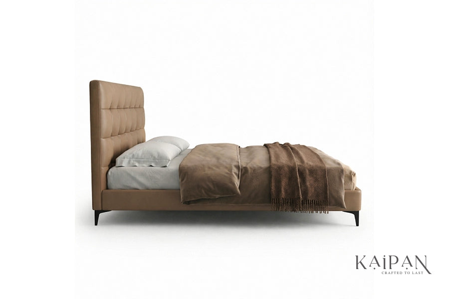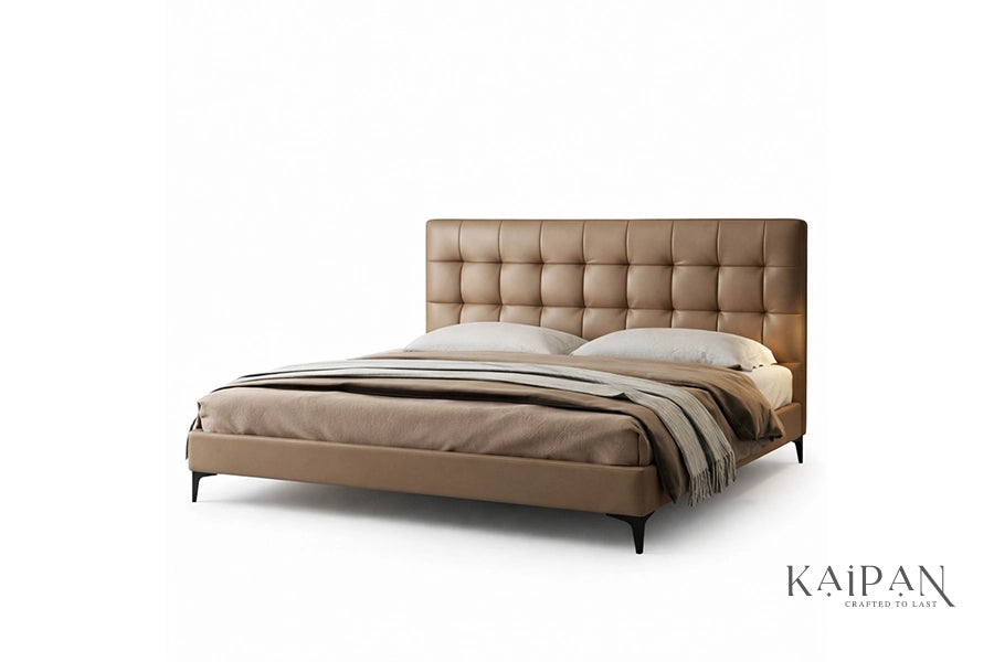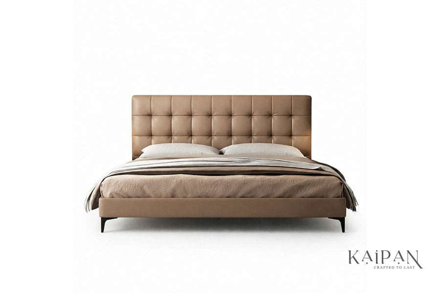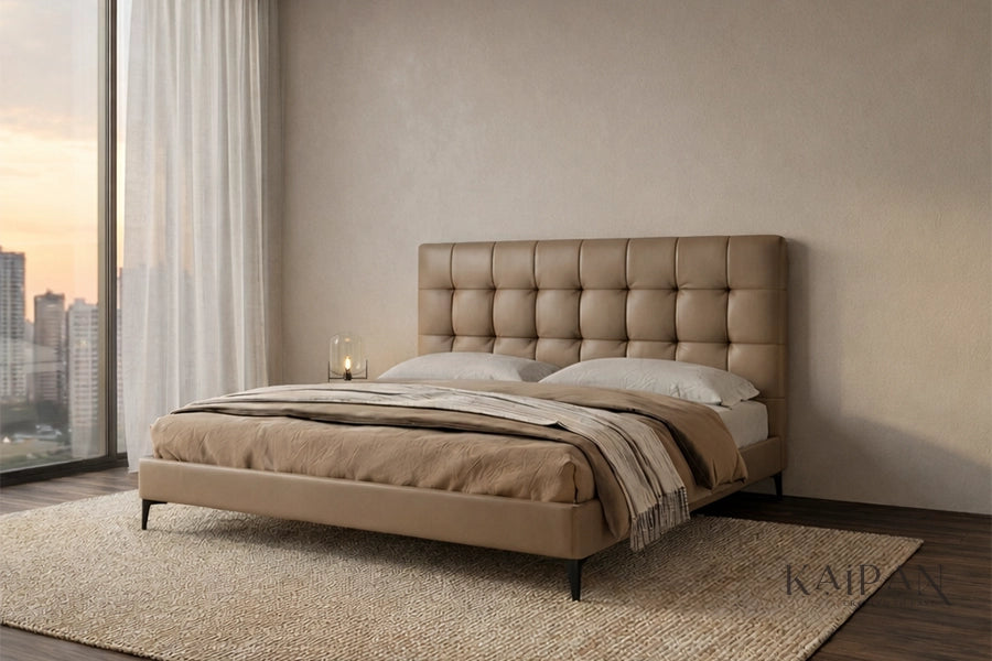 This bed features a clean, upholstered headboard with classic square tuft detailing that brings structure and timeless appeal to its design. Paired with a sleek, low-profile frame, it is finished in a warm neutral fabric that adds comfort and balance to contemporary bedroom interiors. Designed for everyday comfort and reliable support, it delivers a refined blend of simplicity, durability, and understated luxury.
