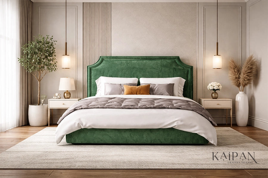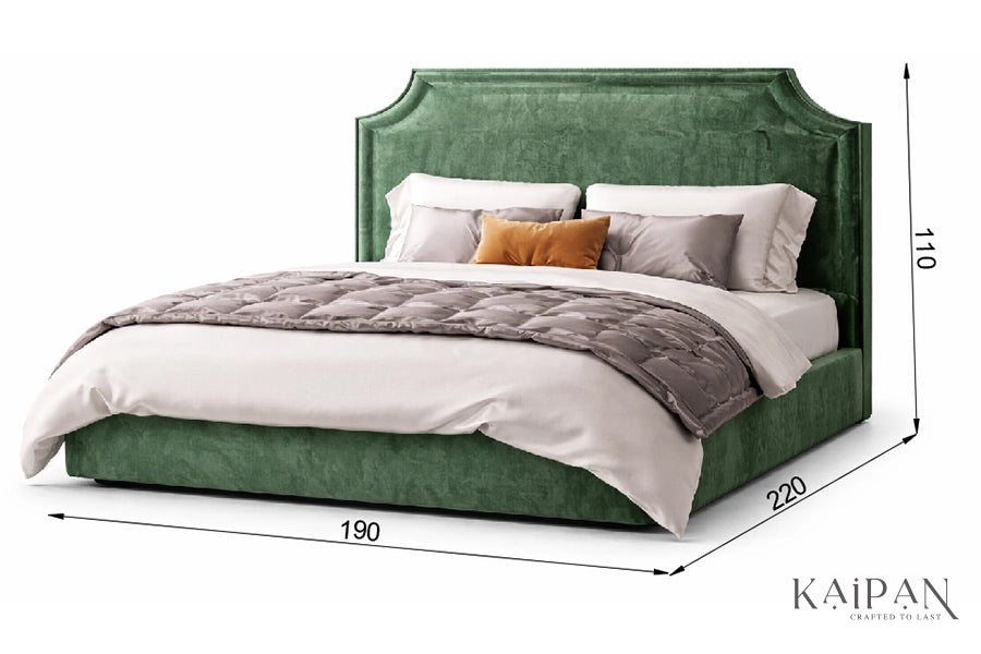 Design Details: Distinctive silhouette featuring a sculpted, padded headboard with refined curved edges, creating a bold yet luxurious focal point for contemporary bedrooms.