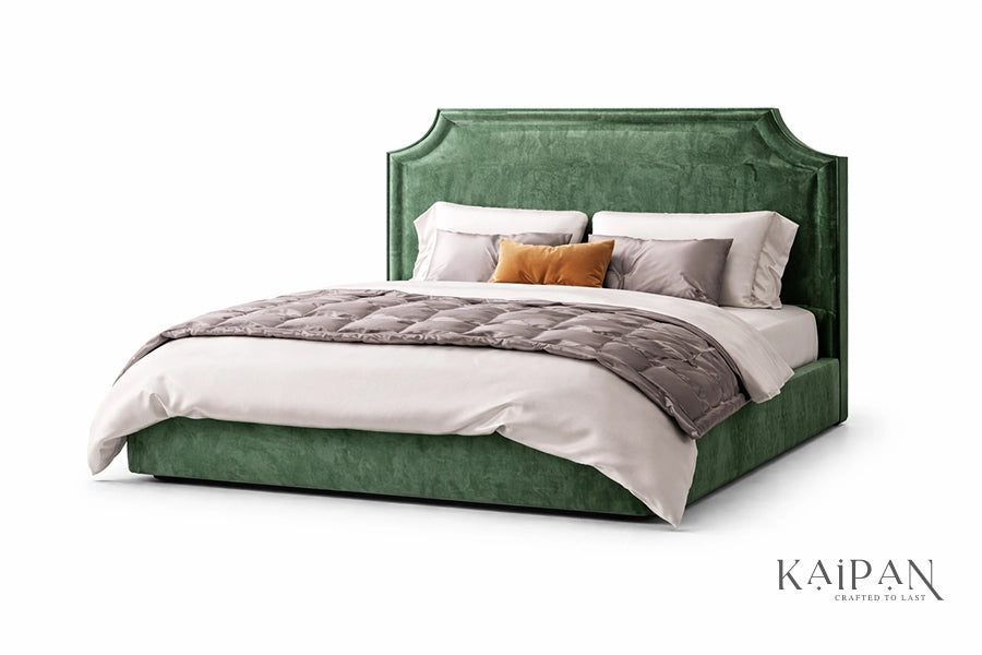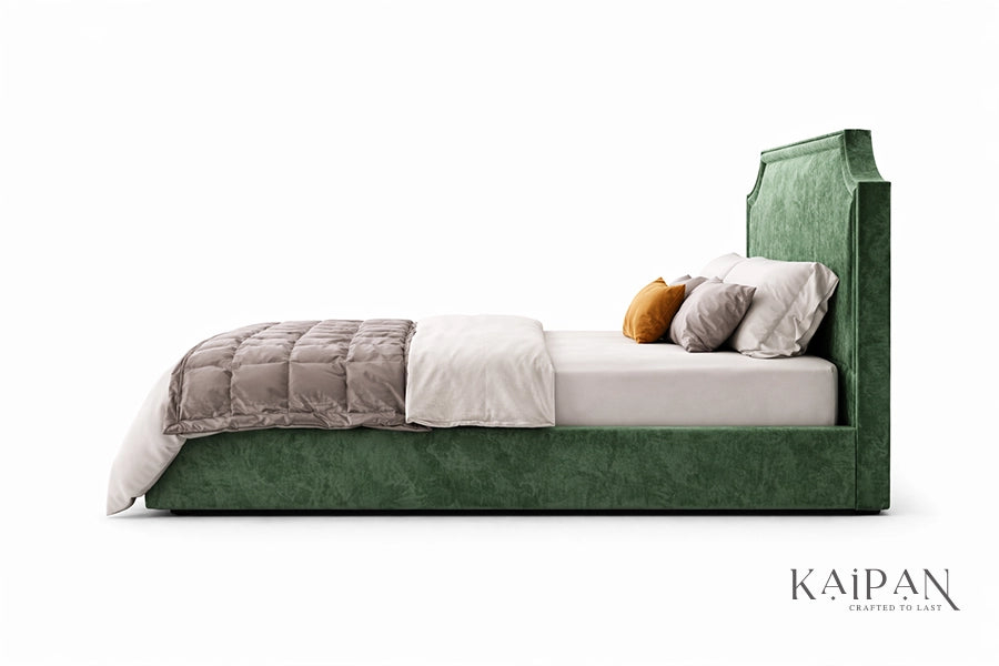 This bed features a bold, upholstered headboard with a distinctive sculpted outline, creating a striking yet elegant focal point. Finished in a rich, textured fabric, it brings depth, warmth, and a sense of refined character to contemporary bedrooms. Designed for everyday comfort and reliable support, it balances expressive design with understated luxury for a truly elevated sleeping experience.