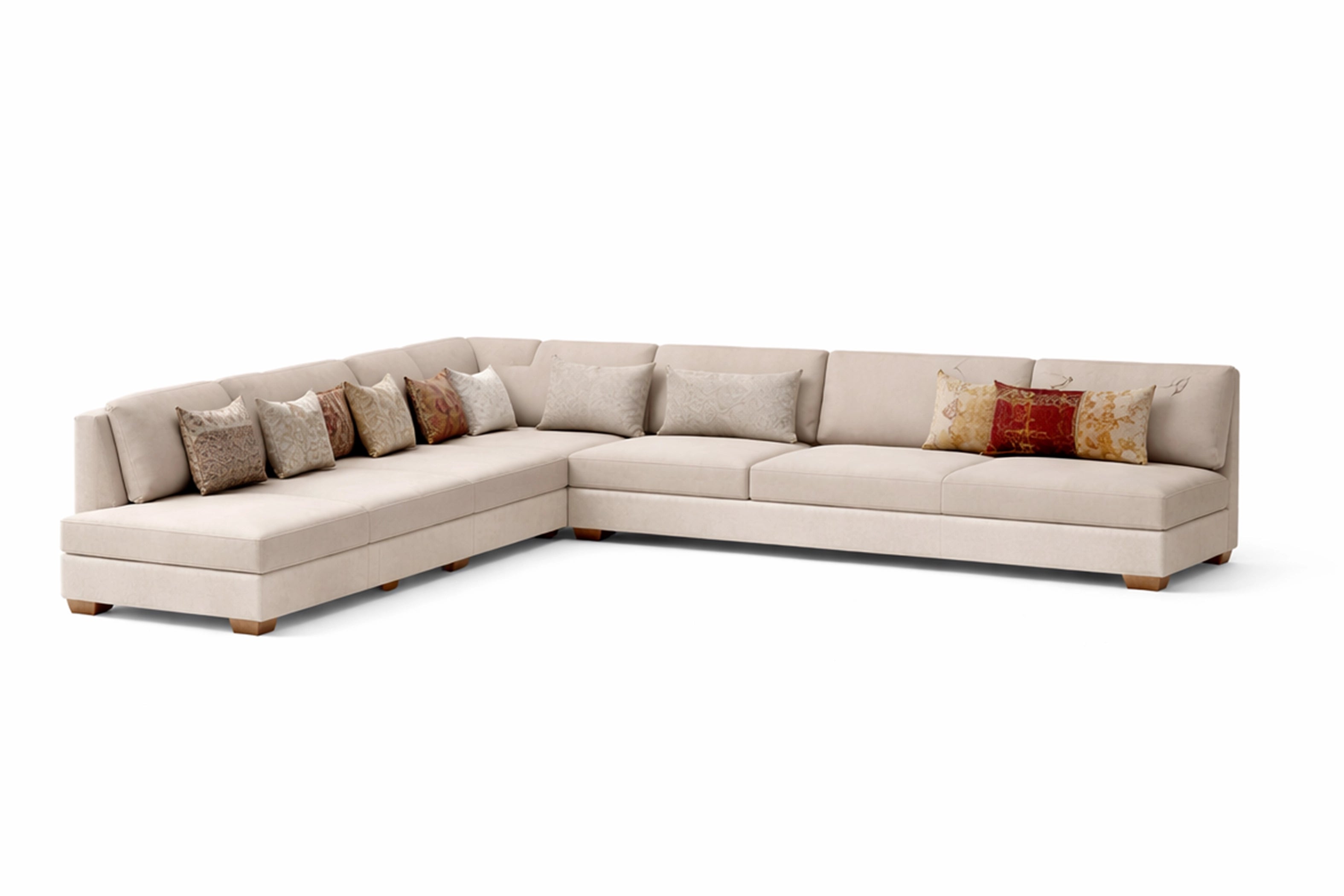 This luxurious sectional sofa set is designed to create a grand yet inviting seating experience for both indoor and covered outdoor spaces. Featuring a spacious wraparound layout with deep, well-cushioned seating, it offers exceptional comfort ideal for family gatherings and elegant entertaining. Upholstered in soft, neutral-toned fabric and complemented by coordinated accent cushions, the set blends timeless design with modern functionality. Paired with refined center tables and styled to suit classic or contemporary interiors, this sofa set brings together comfort, sophistication, and versatility, making it a perfect centerpiece for majlis-style lounges, living rooms, or upscale outdoor settings.