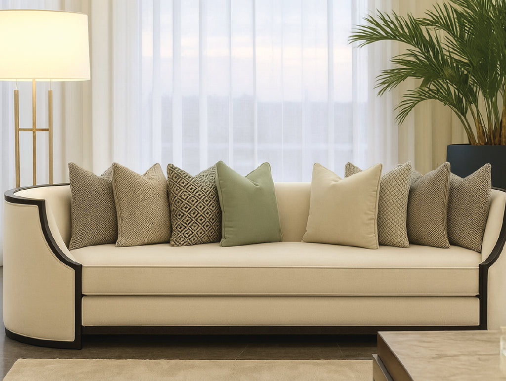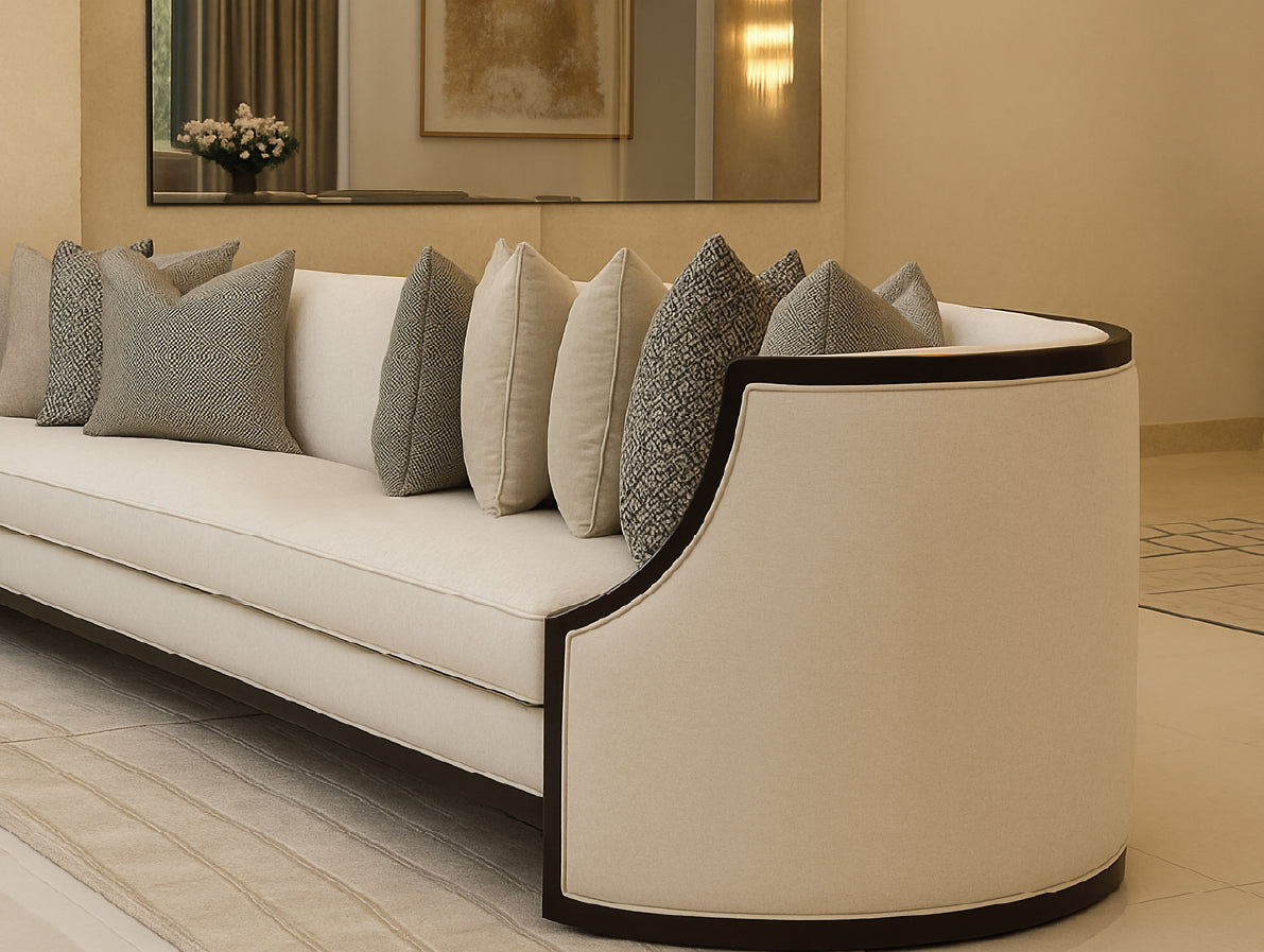 A luxurious crescent-shaped majlis with elegant upholstery, premium comfort, and a modern spacious design. perfect for stylish family gatherings and VIP hospitality.