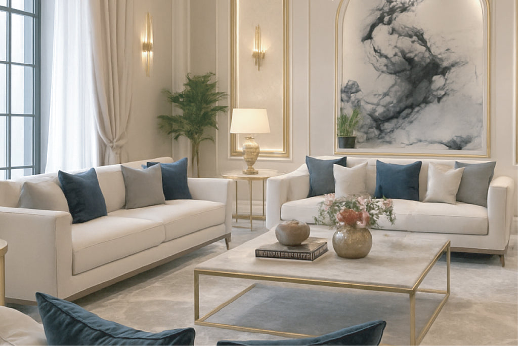 A luxurious palace-style majlis designed with rich detailing, plush seating, and elegant gold accents. Featuring a grand chandelier centerpiece and exquisite craftsmanship, it creates an atmosphere of pure sophistication. perfect for distinguished hospitality and royal interiors.