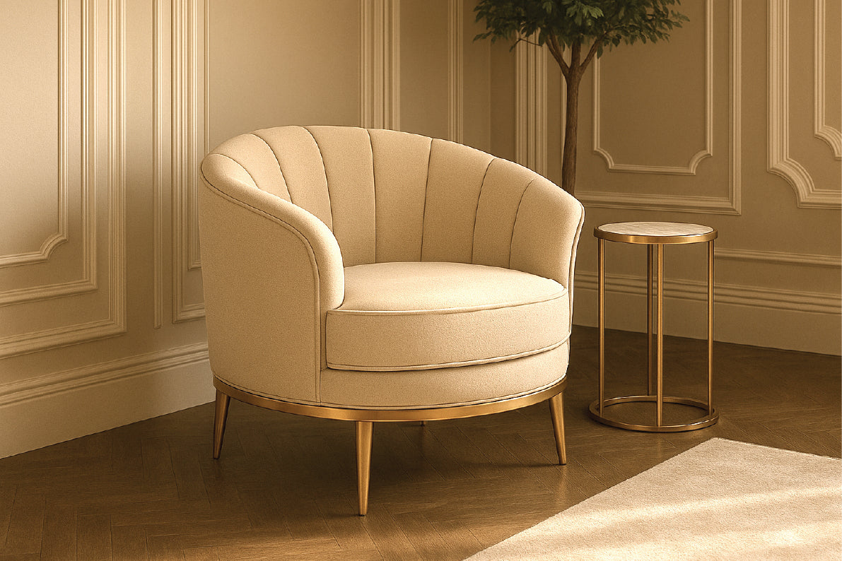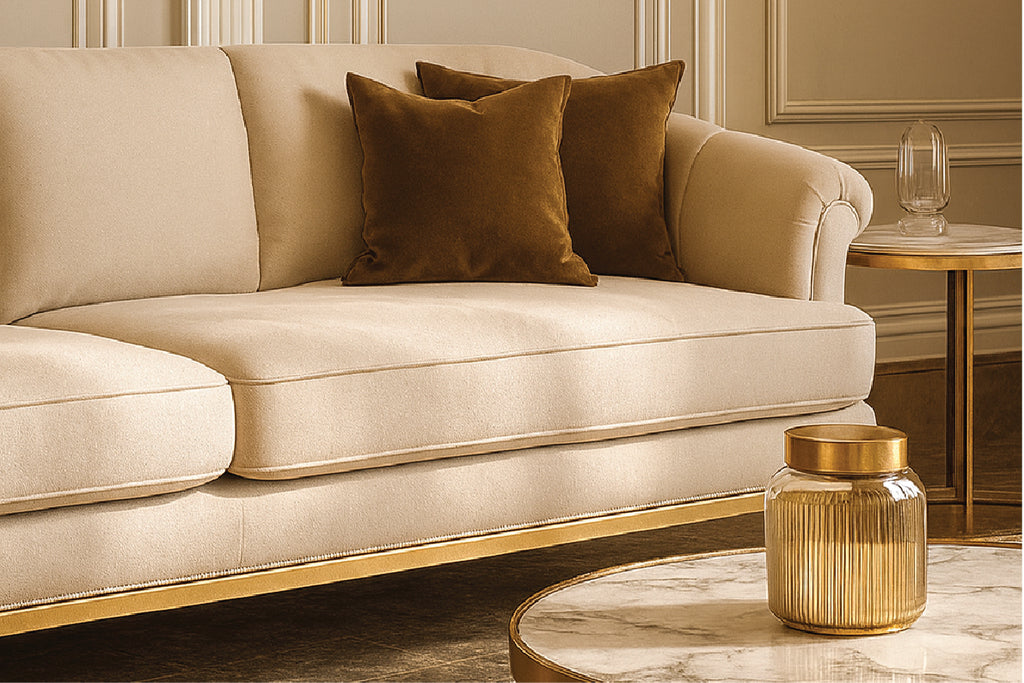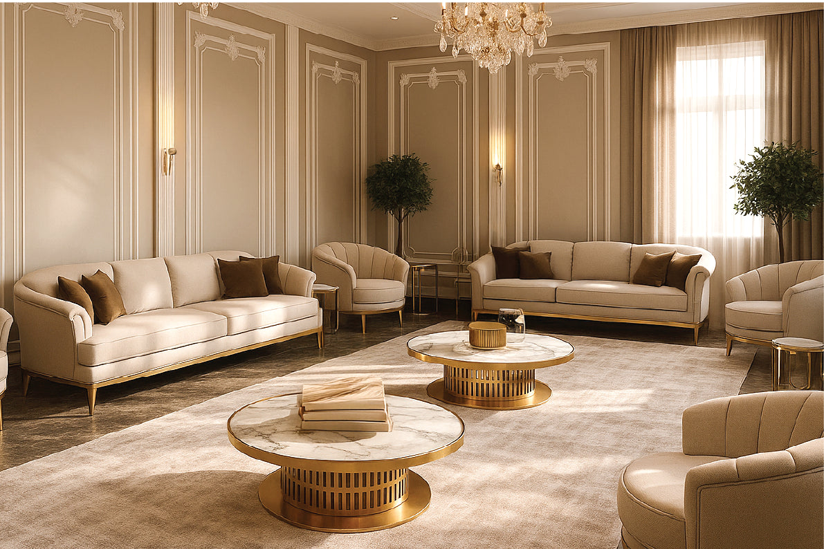 A refined luxury majlis featuring smooth curves, rich neutral tones, and gold accents. Designed for elegant gatherings, it combines timeless style with superior comfort. perfect for sophisticated modern living..