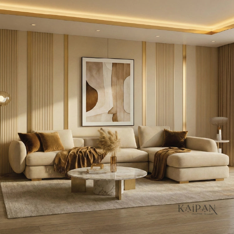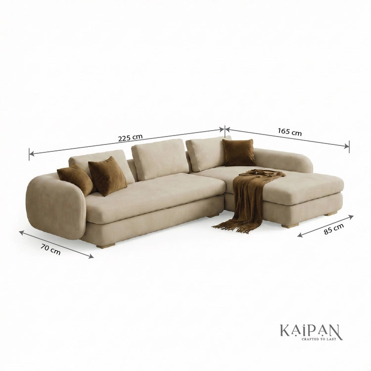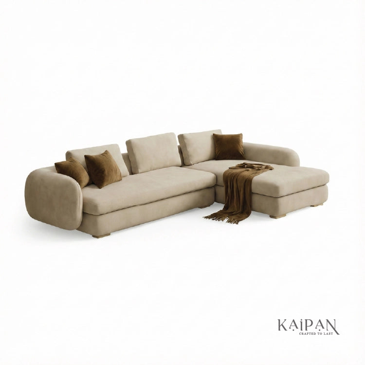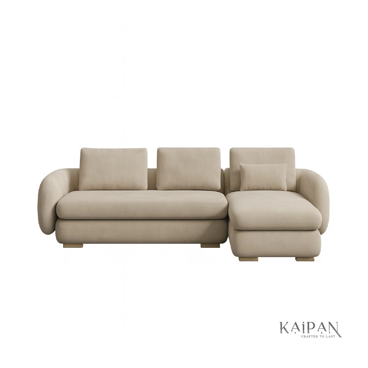 This sectional sofa features a clean, modern design with plush cushions and a spacious layout for relaxed lounging. Upholstered in a soft, neutral fabric, it brings warmth and elegance to contemporary interiors. Thoughtfully designed for comfort and flexibility, it creates a welcoming centerpiece for everyday living and entertaining.