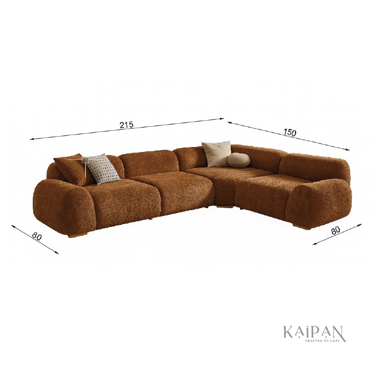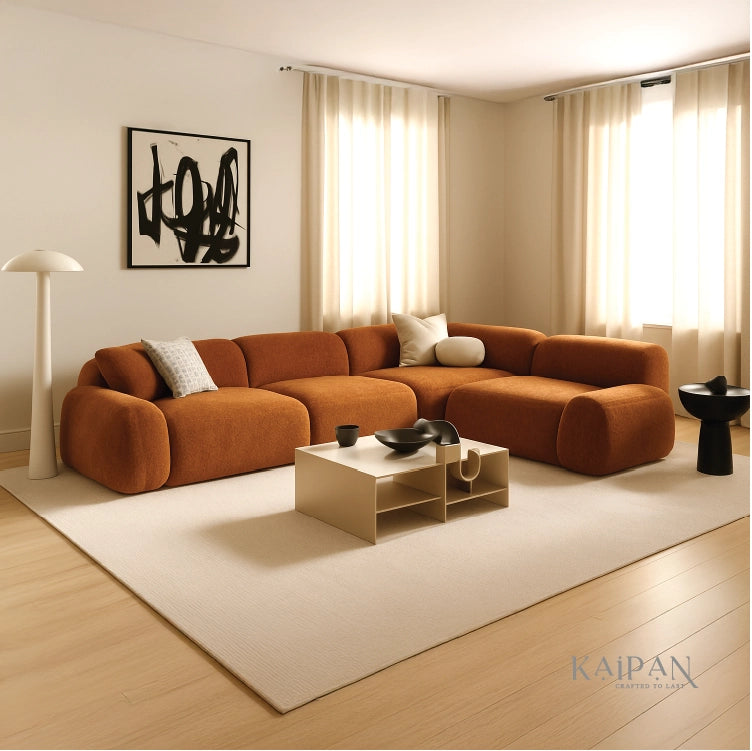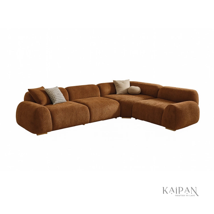 This modular sofa features a bold, sculptural design with generously padded forms that invite relaxed lounging. Upholstered in a rich, textured fabric, it brings warmth and character to the living space while offering flexible seating for modern interiors. Designed for comfort and visual impact, it creates a welcoming and stylish focal point.