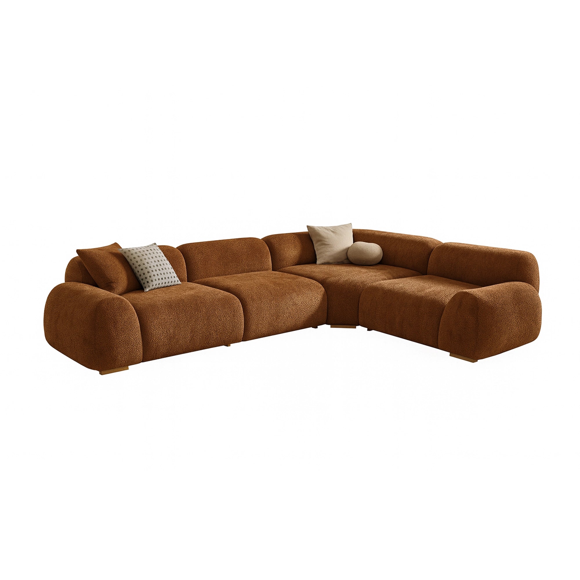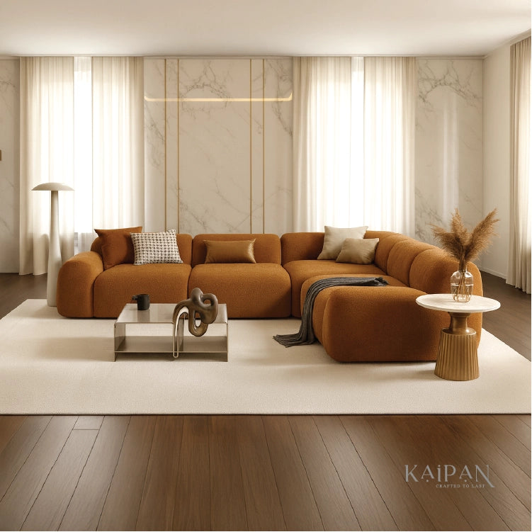 Design Details: Modular curved seating with generously rounded forms and deep cushions, creating a contemporary lounge-style silhouette that feels warm, inviting, and modern.