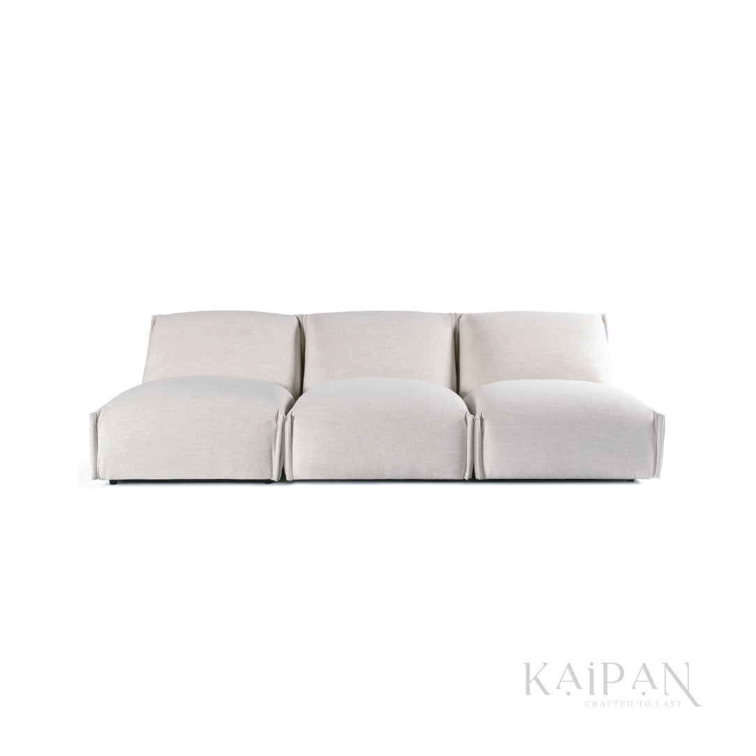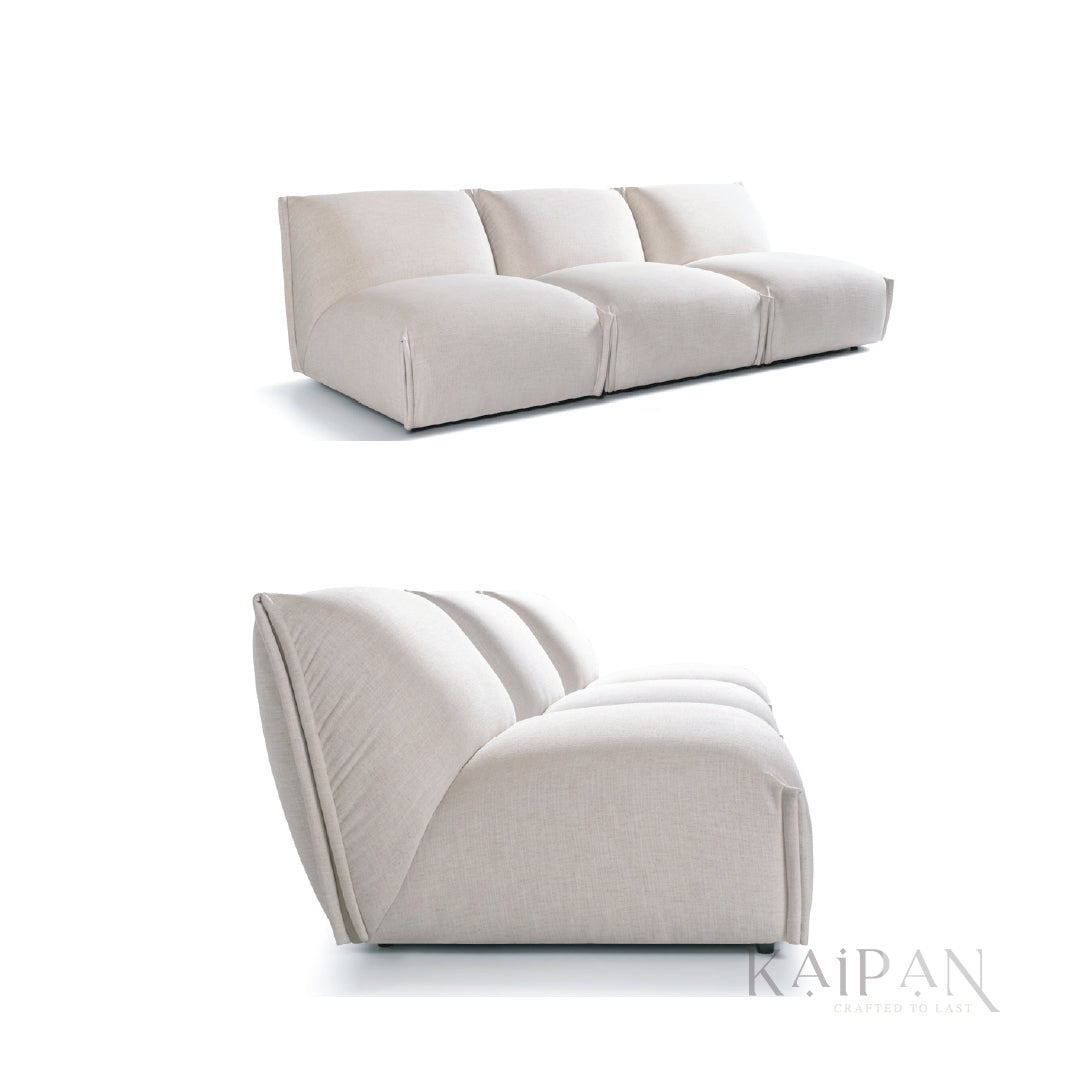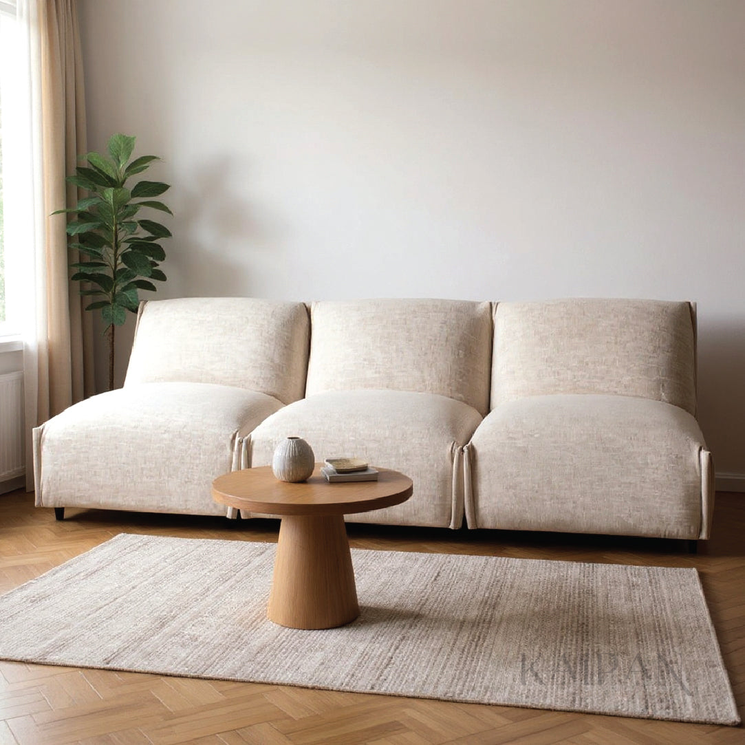 "This sofa brings a relaxed, contemporary feel with its soft curves and low, grounded profile. The textured beige fabric adds warmth, while the wide, cushioned seats create an inviting, laid-back look. Simple, modern, and effortlessly comfortable, it fits beautifully into open, airy interiors."