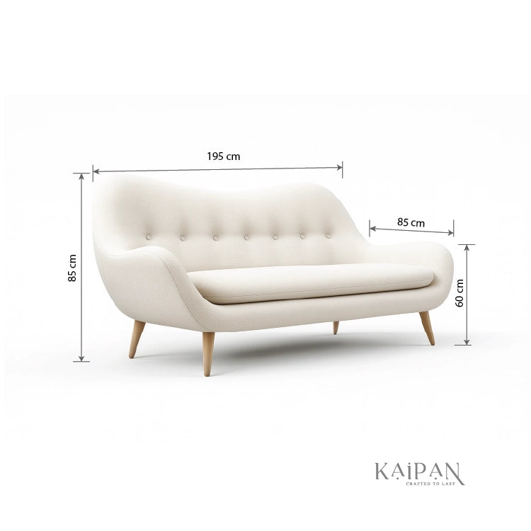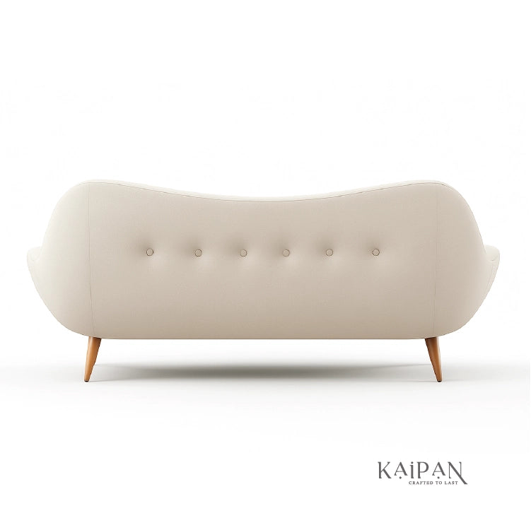 This sofa showcases a graceful, mid-century–inspired design with gently curved arms and a softly tufted backrest. Finished in a light, neutral fabric and supported by slim wooden legs, it brings an airy, refined feel to modern and classic interiors alike. Comfortable and thoughtfully designed, it adds warmth and timeless charm to any living space.