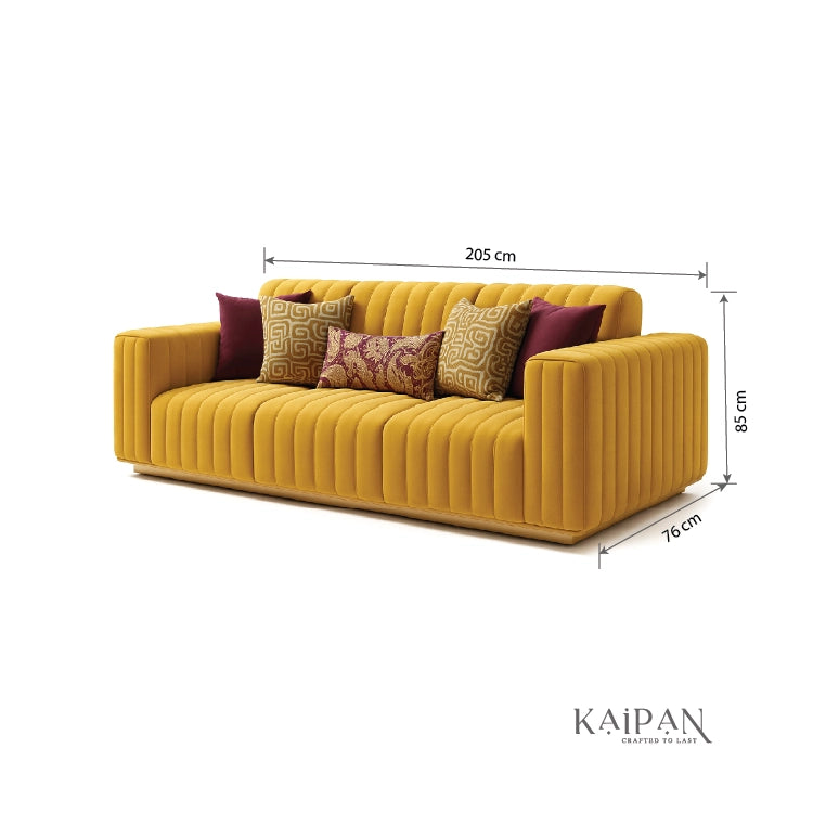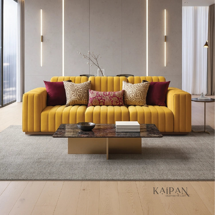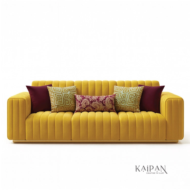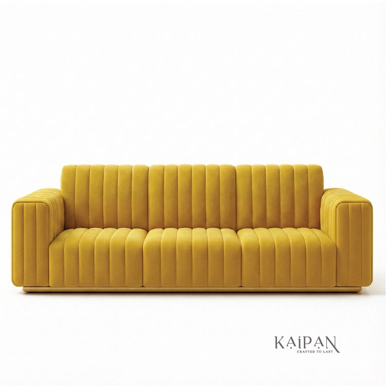 This sofa makes a striking statement with its bold colour and sculpted, channel-tufted design. The plush upholstery and deep seating provide exceptional comfort, while the structured silhouette adds a touch of modern luxury. Perfect for contemporary interiors, it brings warmth, character, and refined style to the living space.