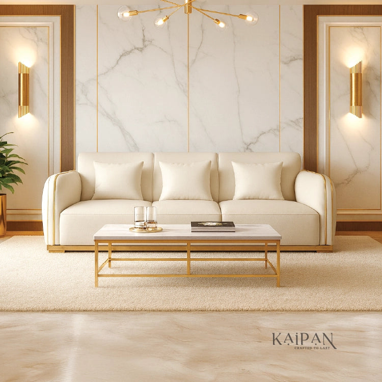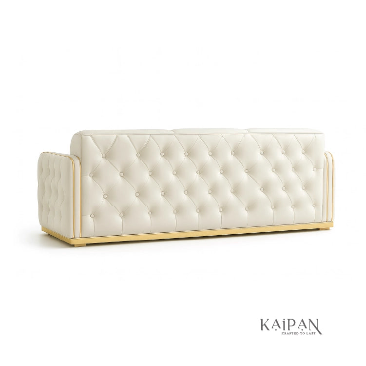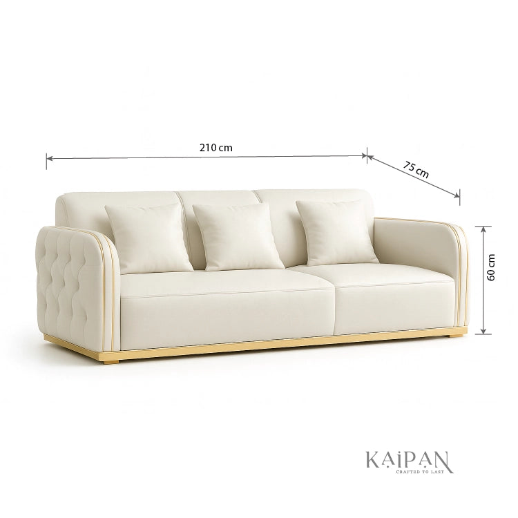 This sofa combines classic elegance with modern comfort through its softly tufted detailing and clean, structured form. Upholstered in a light, luxurious fabric, it brings a bright and refined feel to the living space. Designed for both style and relaxation, it offers supportive seating and timeless appeal for contemporary interiors.