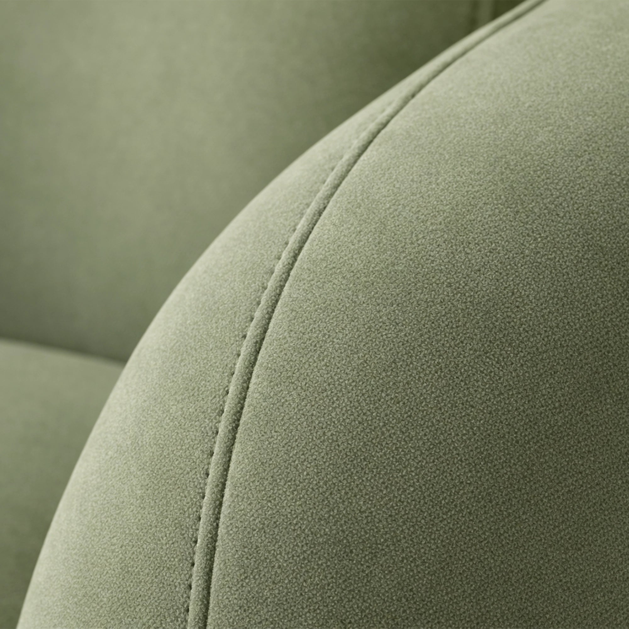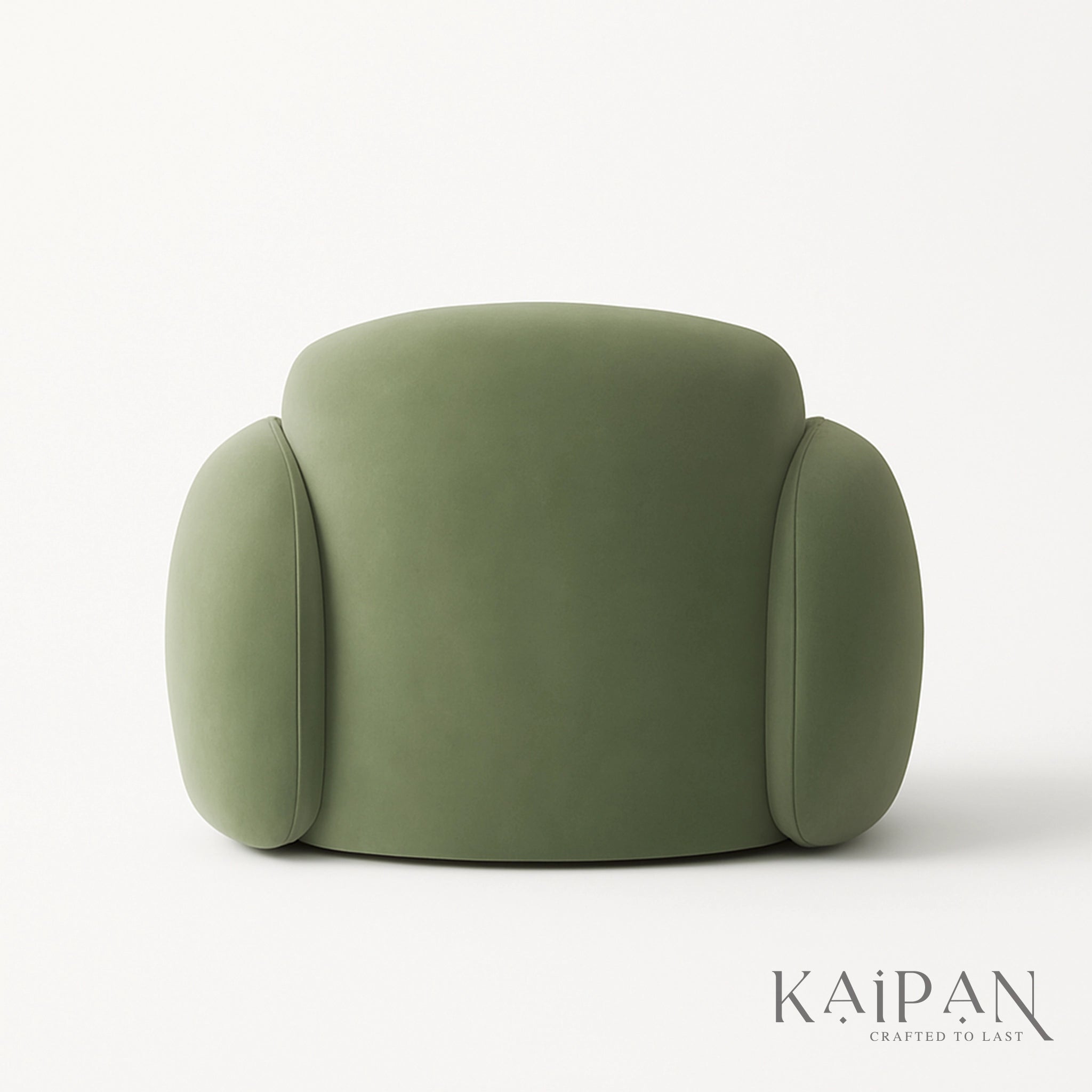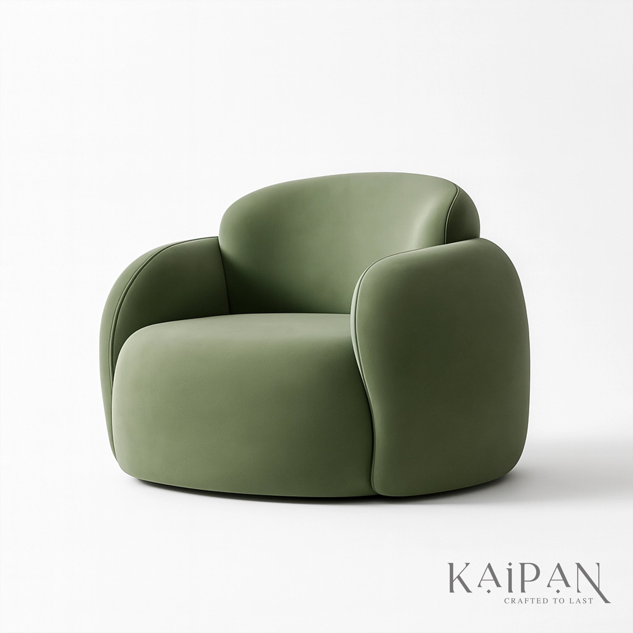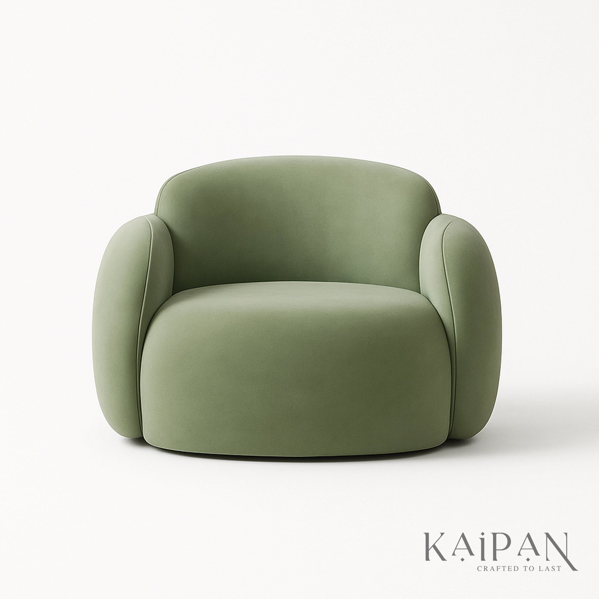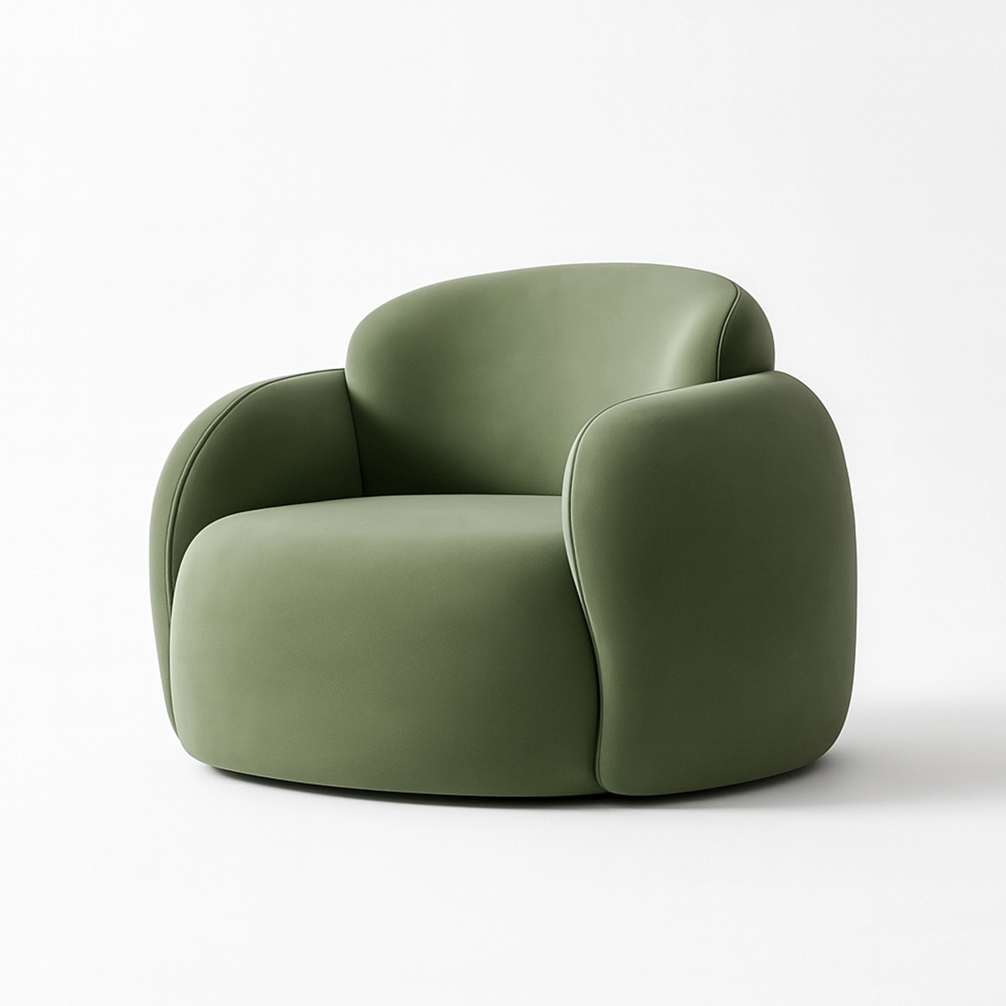 This modern armchair features a smooth, rounded silhouette designed for relaxed and comfortable seating. Upholstered in a soft, premium fabric, it offers a generously cushioned seat with gently curved armrests and a supportive backrest. Its compact, low-profile design makes it an ideal choice for contemporary living rooms, bedrooms, or lounge spaces, adding subtle elegance and a calm, modern touch to any interior.