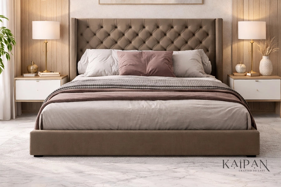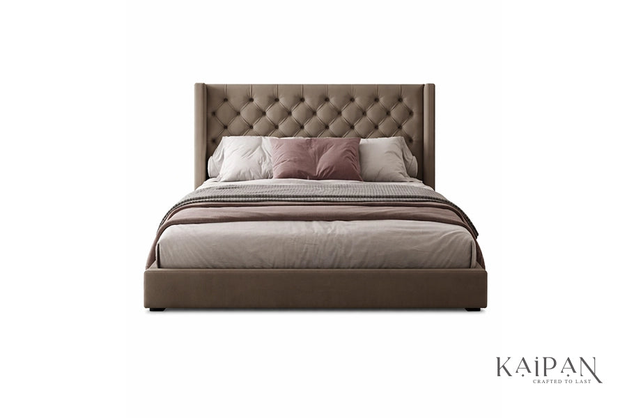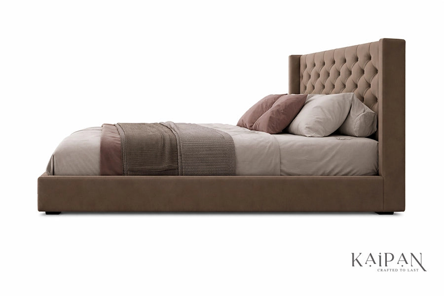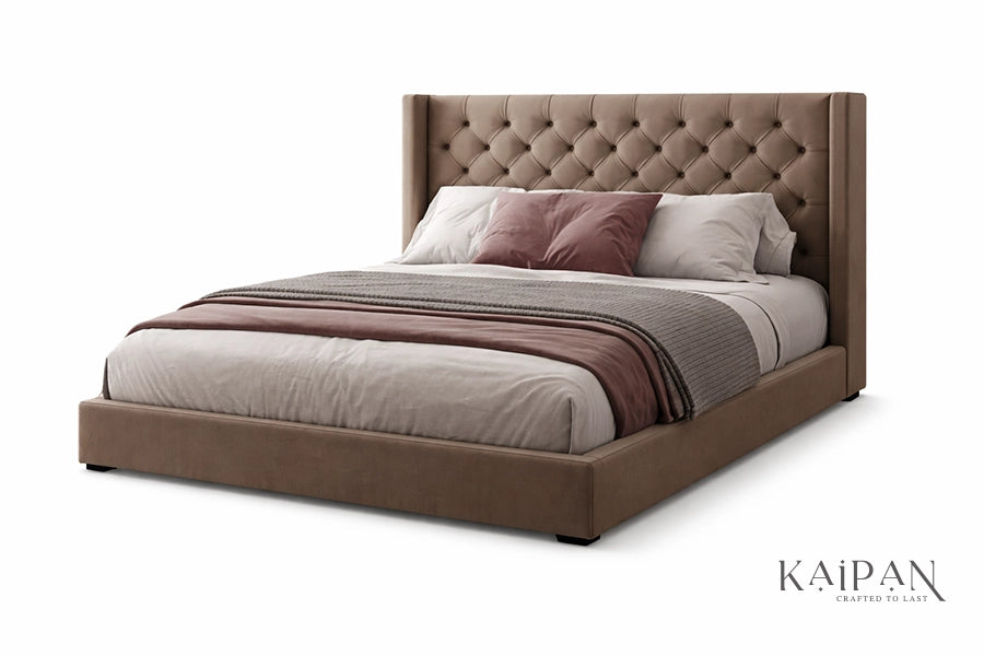 This bed features a tall, fully upholstered headboard with intricate diamond-style tufting that adds depth and character to its design. Combined with a clean, low-profile frame, it is finished in a rich neutral fabric that brings warmth and understated elegance to modern bedrooms. Designed for lasting comfort and dependable support, it delivers a refined blend of craftsmanship, softness, and everyday luxury.