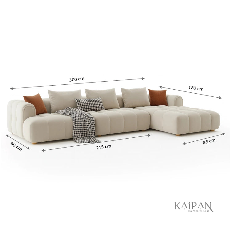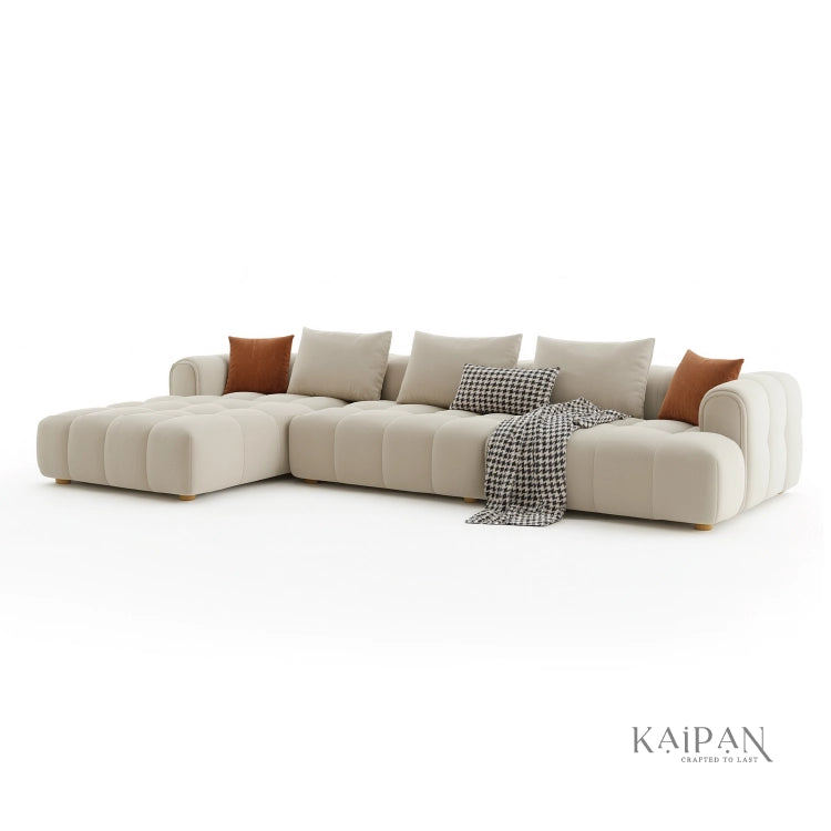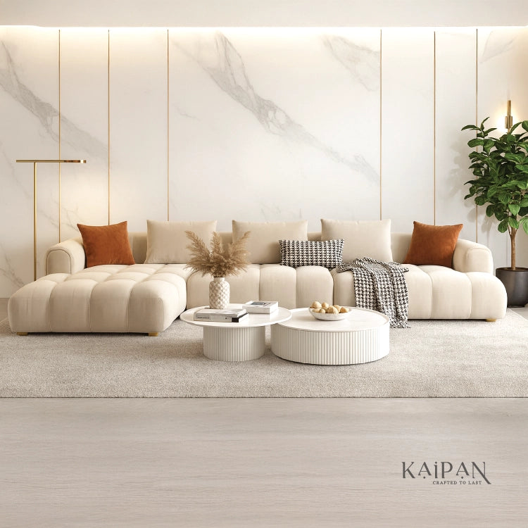 This modular L shaped sofa features a soft, sculptural design with plush cushioning and a low, relaxed profile. Upholstered in a light, neutral fabric, it creates a calm and inviting atmosphere while offering flexible seating for modern living. Designed for comfort and style, it brings warmth, balance, and understated luxury to any living space.