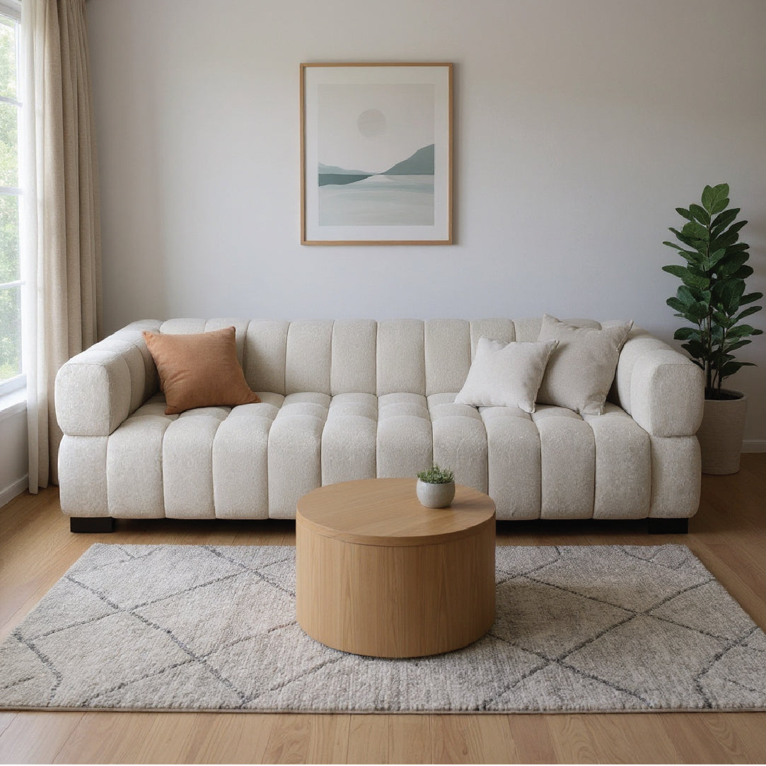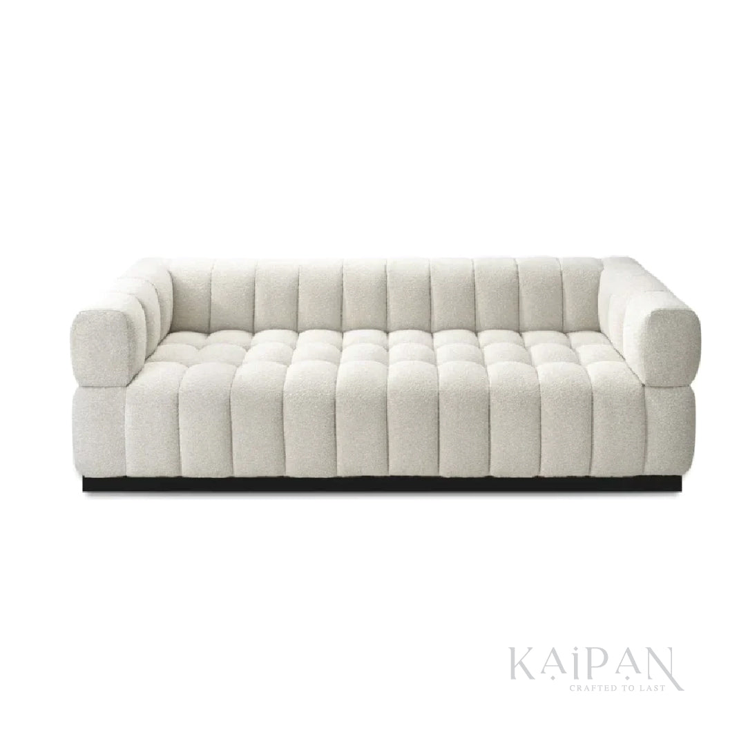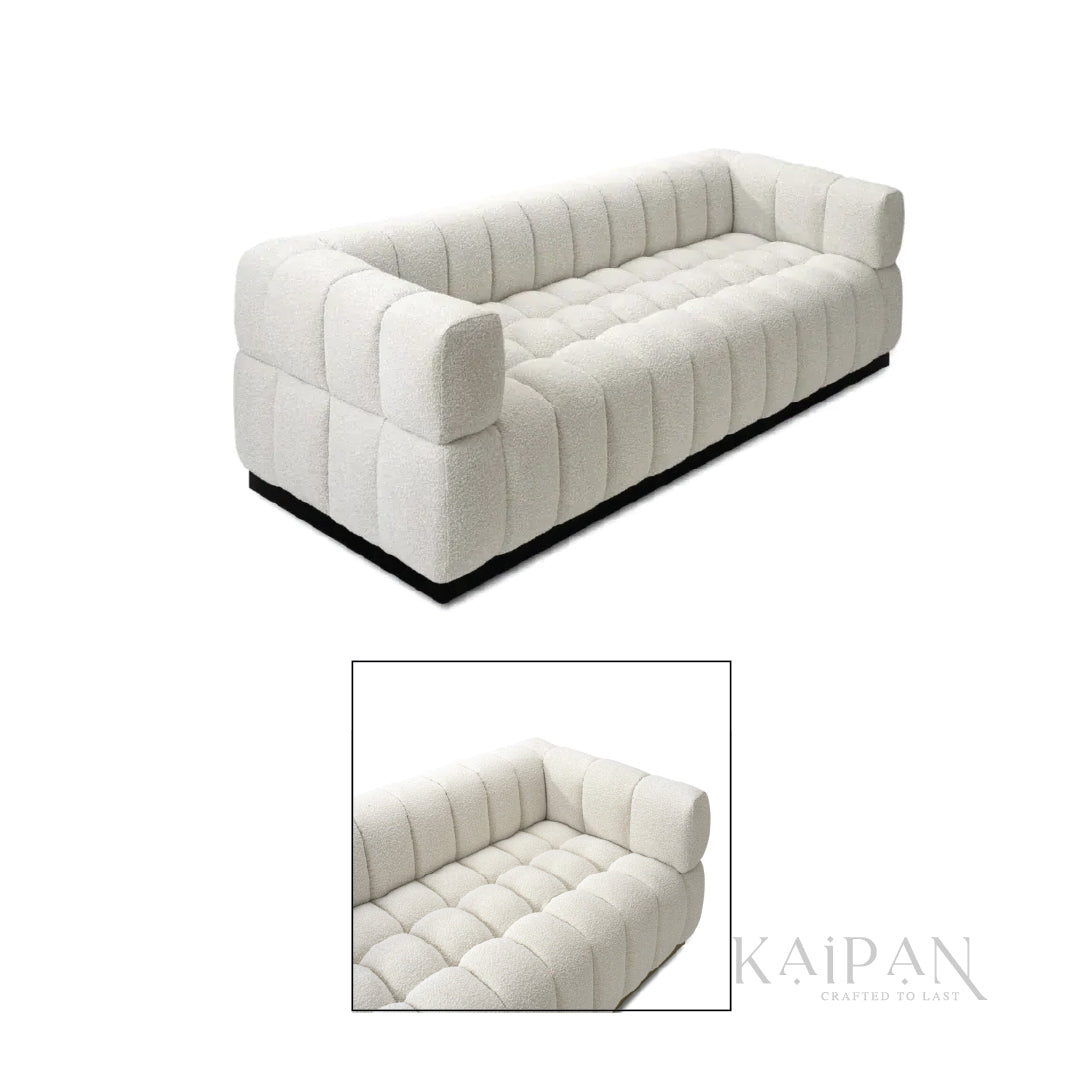 "With its beautifully sculpted, channeled design, this sofa adds a soft yet sophisticated presence to any room. The textured ivory fabric, paired with the low wooden base, creates a warm and inviting look while keeping the overall style modern and refined. Comfortable, structured, and visually striking, it becomes an effortless centerpiece in contemporary living spaces."