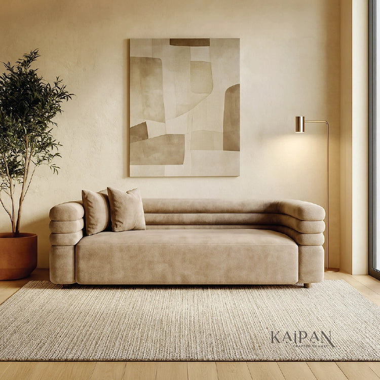 This sofa features a soft, layered silhouette with gently padded arms and a calm, neutral finish. Upholstered in a smooth, textured fabric, it offers deep comfort while bringing a warm and understated elegance to the living space. Designed for relaxed lounging, it blends modern simplicity with timeless appeal.