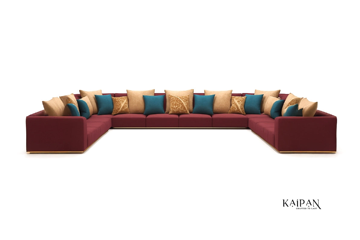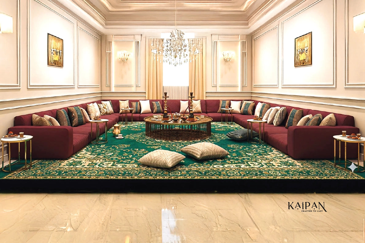 This Majlis seating is designed with a grand, continuous layout that encourages comfort, conversation, and hospitality. Upholstered in rich fabric with plush cushions and elegant contrast detailing, it creates a warm and dignified atmosphere for traditional gatherings. Thoughtfully crafted, it reflects the essence of classic Majlis style while offering modern comfort and refinement.